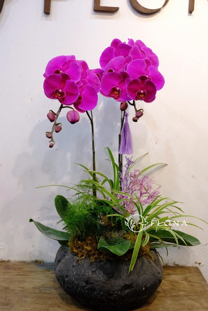 Sở hữu vẻ đẹp thanh khiết và sang trọng, Majestic Poise mang đến cảm giác của sự tự tin và uy quyền được tiết chế bằng nét dịu dàng. Hai nhánh Phalaenopsis Orchid (lan hồ điệp) bung nở rực rỡ trong sắc tím hoàng gia, tượng trưng cho sự thịnh vượng và thành công viên mãn. Xen kẽ là những tầng lá xanh, Asparagus Fern (dương xỉ tơ) mềm mại cùng điểm nhấn Succulent Plant (sen đá), tạo nên bố cục hài hòa và đầy sức sống. Chậu đá đen tròn hiện đại càng tôn lên phong thái đĩnh đạc của tổng thể.