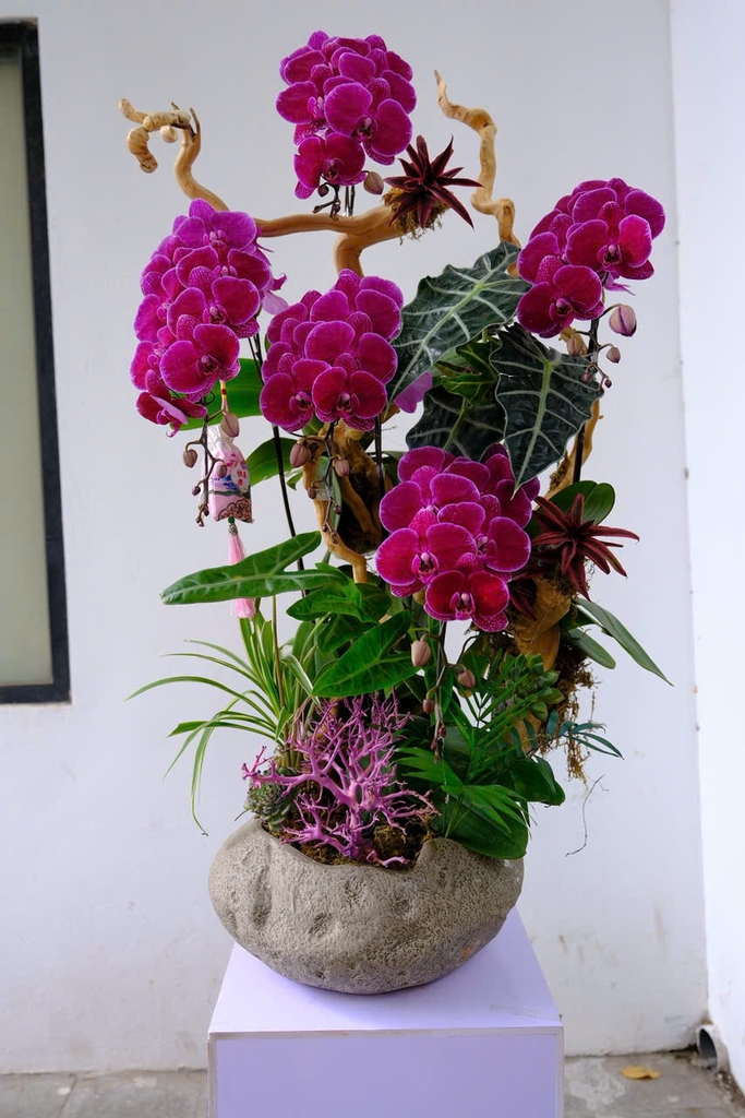 Majesty Bloom – biểu tượng của sự thăng hoa và uy quyền. Sắc tím sâu của Phalaenopsis Orchid (lan hồ điệp) tỏa sáng kiêu hãnh, hòa cùng nhịp điệu của gỗ tự nhiên và sắc xanh Alocasia (môn cảnh), gợi nên phong thái vững vàng và đẳng cấp của người lãnh đạo.