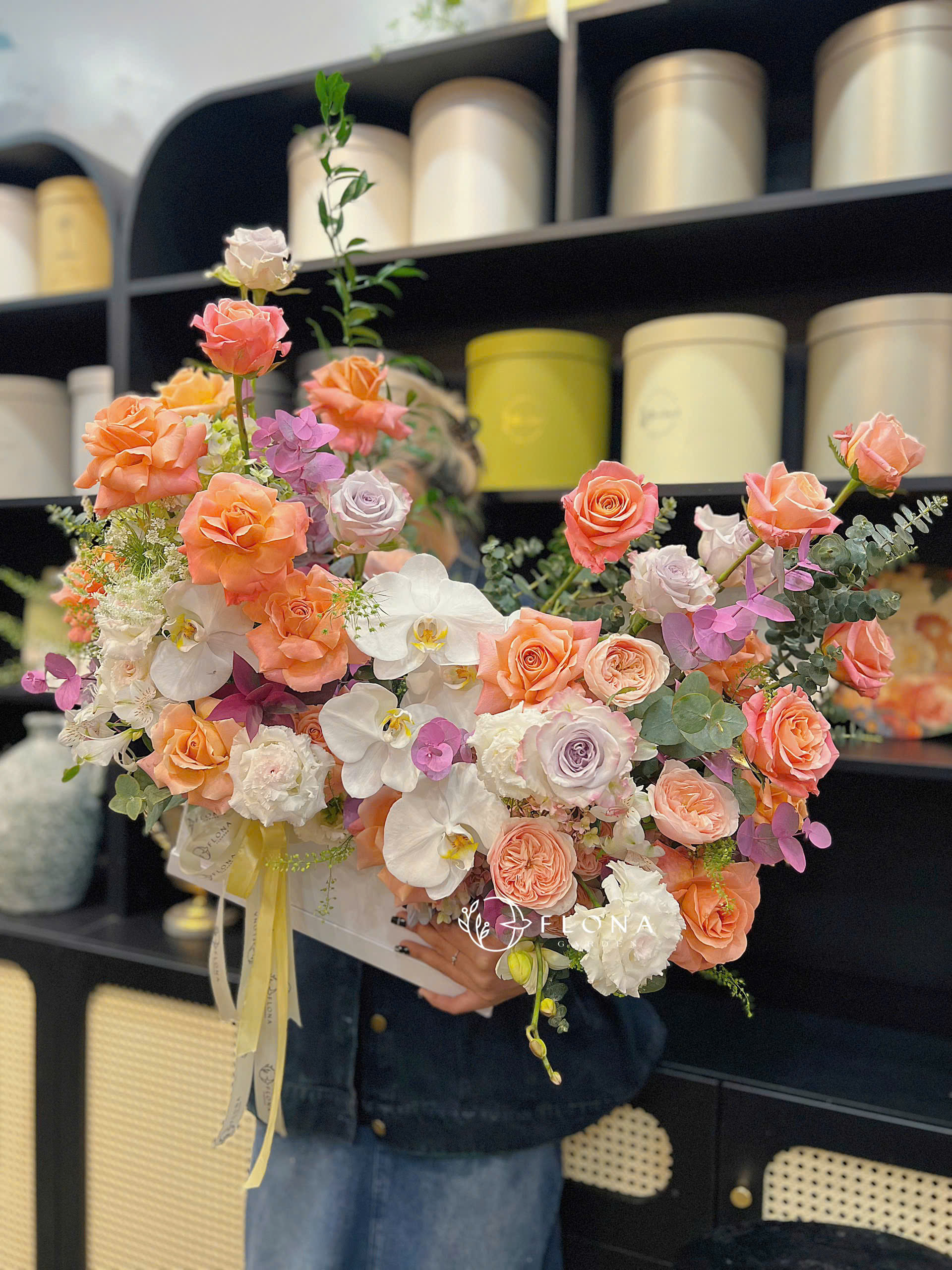 Matin d’Aurore là hộp hoa mang sắc cam đào tinh tế, điểm xuyết trắng tím dịu dàng. Sự kết hợp giữa Rose (hoa hồng), Orchid (lan hồ điệp) và Lisianthus (cát tường) gợi cảm giác ấm áp và trong trẻo như buổi sớm ban mai – nơi ánh nắng vừa chạm khẽ lên cánh hoa, khơi dậy một ngày mới tràn đầy hy vọng.