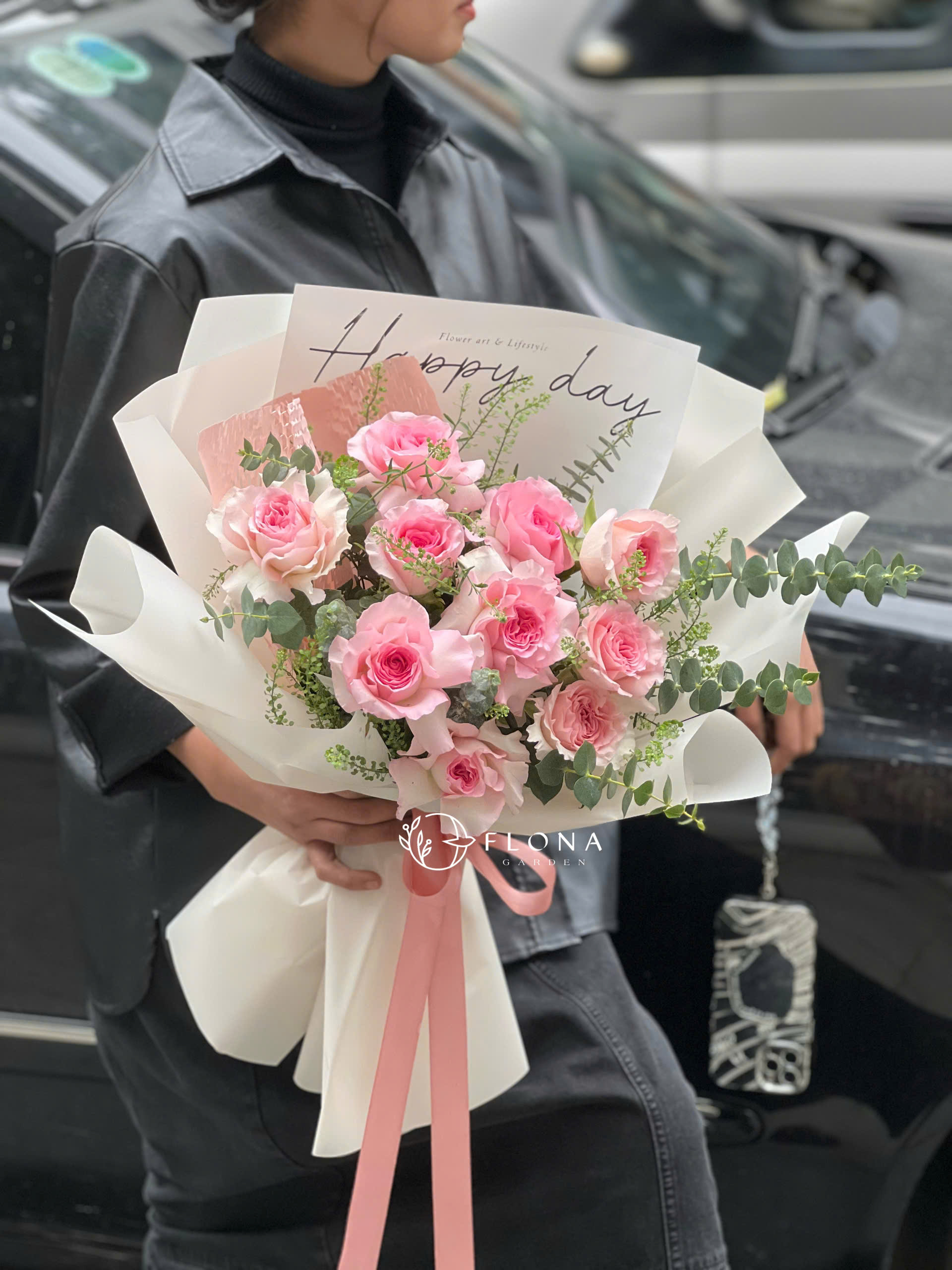 Những đóa Rose (hoa hồng) và Lisianthus (hoa cát tường) khẽ chạm vào nhau như giai điệu ngọt ngào của hạnh phúc — giản dị mà đắm say, như lời chúc ấm áp gửi đến một ngày thật tươi đẹp.