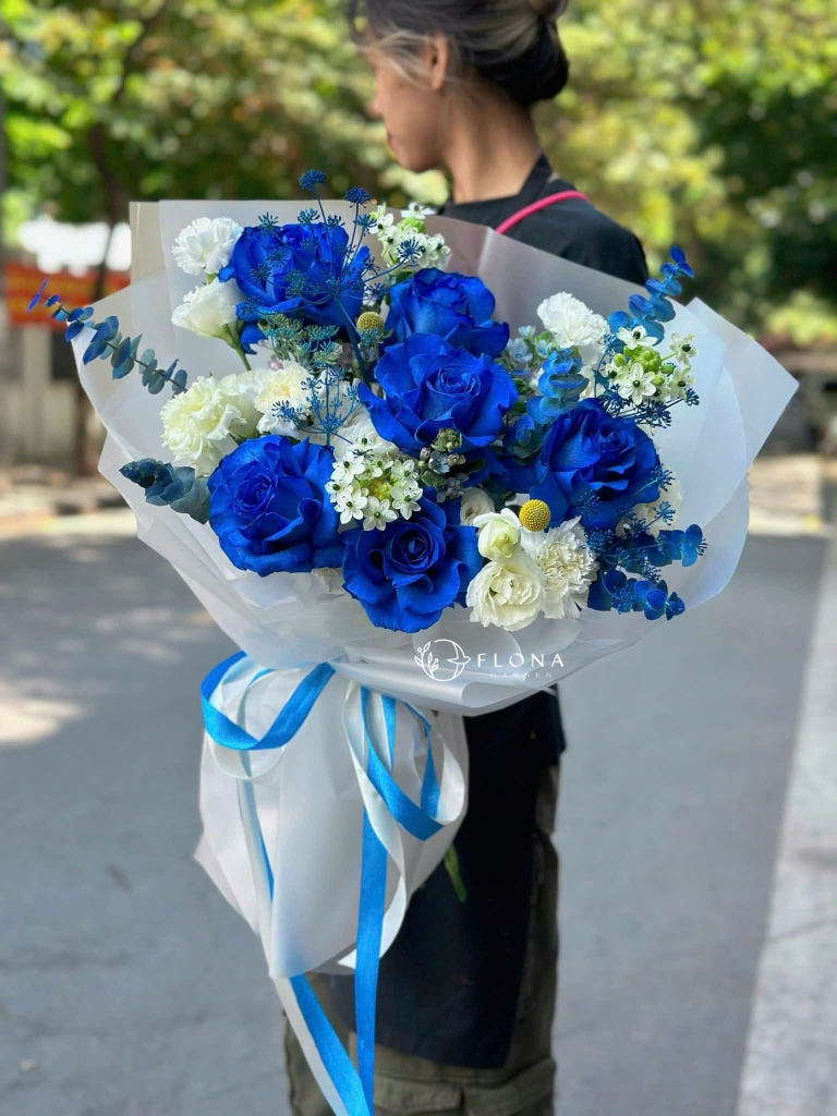 Midnight Whisper – lời thì thầm của đêm xanh, nơi những đóa Blue Rose (hoa hồng xanh) hòa cùng White Carnation (hoa cẩm chướng trắng) và cành Eucalyptus (bạch đàn) dịu nhẹ. Màu xanh sâu thẳm tựa trời đêm tĩnh lặng, mang đến cảm giác thanh khiết, an yên và một chút bí ẩn khó quên.