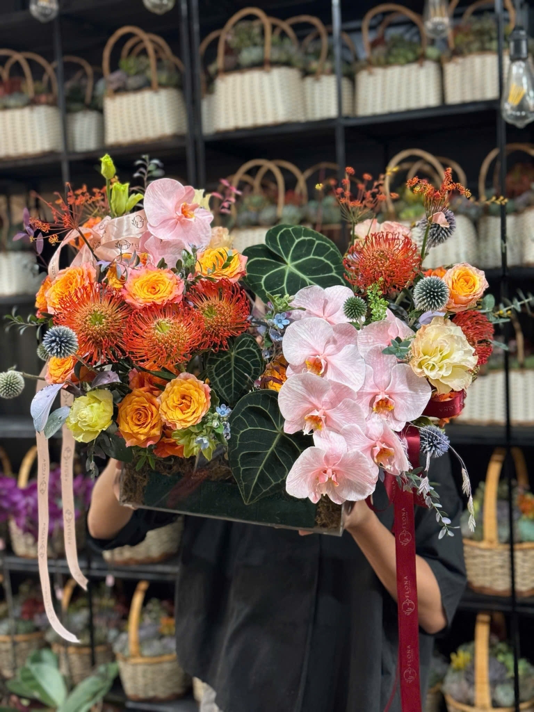 Một bản hòa ca rực rỡ giữa sắc cam nồng ấm của Leucospermum (Hoa kim ngân lửa), nét kiêu sa của Phalaenopsis (Lan hồ điệp) và vẻ cổ điển của hoa hồng vàng đồng. Tất cả được nâng đỡ bởi những tán Alocasia (Môn rừng) xanh thẫm, tạo nên khung cảnh như khu vườn mùa hạ đang cất tiếng gọi. Moon Whisper là món quà của ánh sáng – vừa rạng rỡ, vừa tinh tế, vừa chan chứa yêu thương.