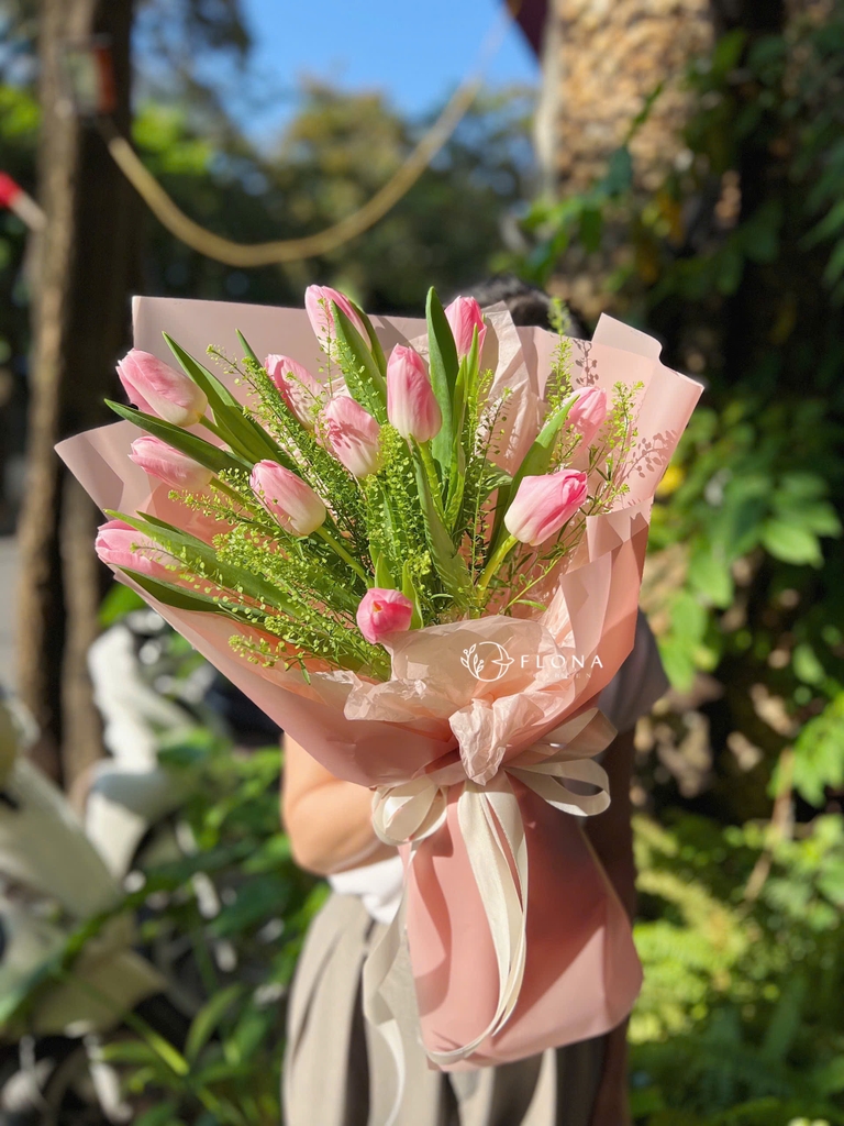 Morning Sun – sớm mai trong vườn hồng, nơi những đóa Pink Tulip (hoa tulip hồng) khẽ nở dưới ánh nắng đầu ngày, tỏa hương dịu dàng giữa sắc lá xanh tươi. Bó hoa mang đến cảm giác trong trẻo, nhẹ nhàng và an lành – như khởi đầu ngọt ngào của một ngày mới đầy hy vọng.