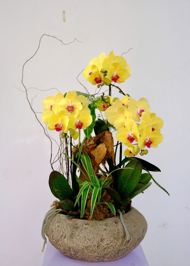Tinh khôi và trang nhã, Golden Grace mang sắc vàng sang trọng của Phalaenopsis Orchid (lan hồ điệp), biểu trưng cho may mắn và thịnh vượng. Những cánh hoa vàng ánh nhẹ, điểm nhụy đỏ quyến rũ, vươn lên từ nền đá tự nhiên cùng mảng xanh thanh mát, tạo nên vẻ đẹp hài hòa giữa sức sống và phong thái doanh nhân. Một tác phẩm tượng trưng cho sự thành công nhẹ nhàng mà đầy khí chất.