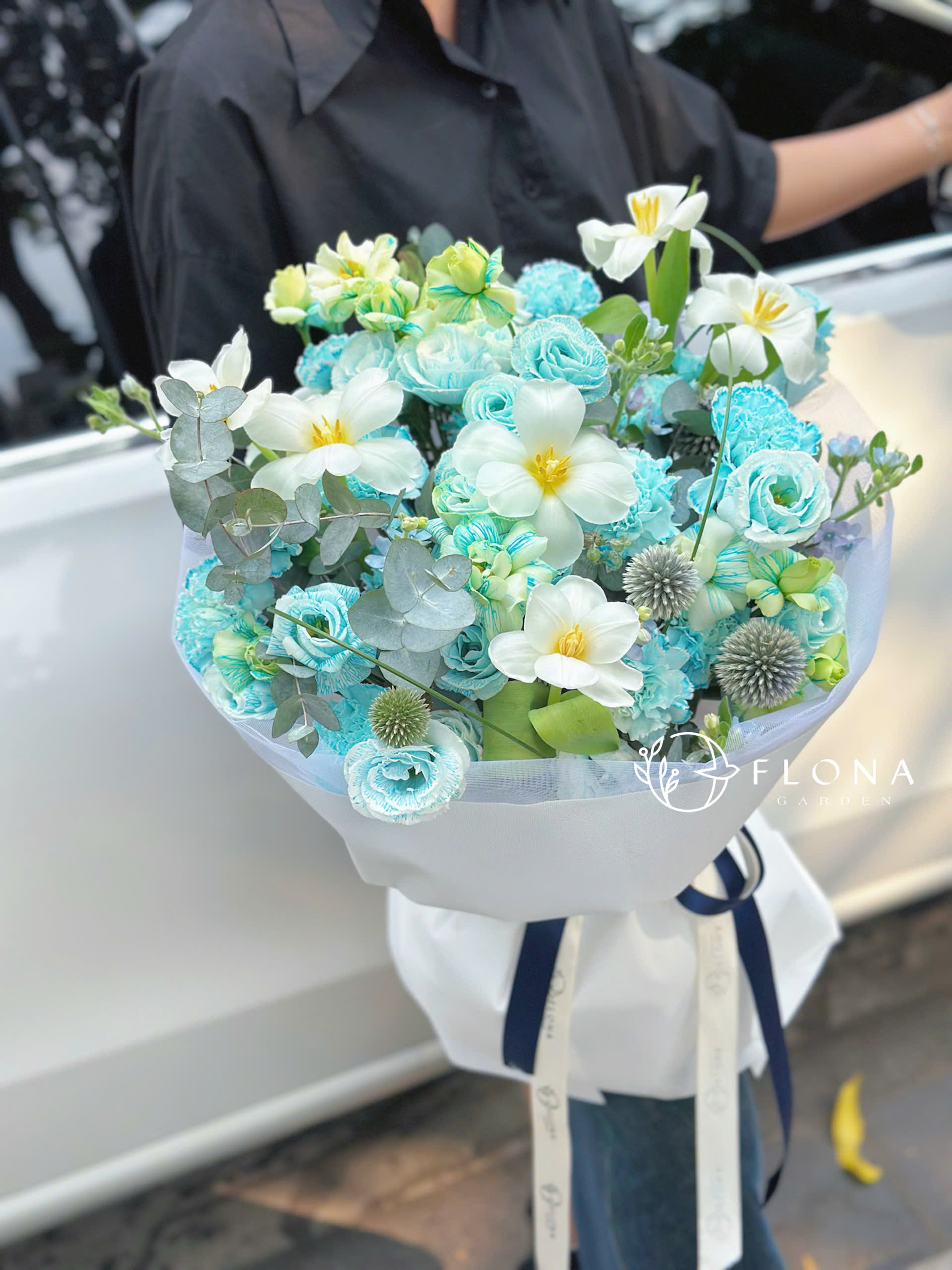 Ocean Whisper – lời thì thầm của biển khơi trong khu vườn xanh mát. Sắc xanh dịu của Lisianthus (hoa cát tường) và Carnation (hoa cẩm chướng) hoà cùng trắng tinh khôi của Lily (hoa loa kèn), mang đến cảm giác trong veo, thanh thoát và bình yên như gió biển khẽ lướt qua làn tóc.