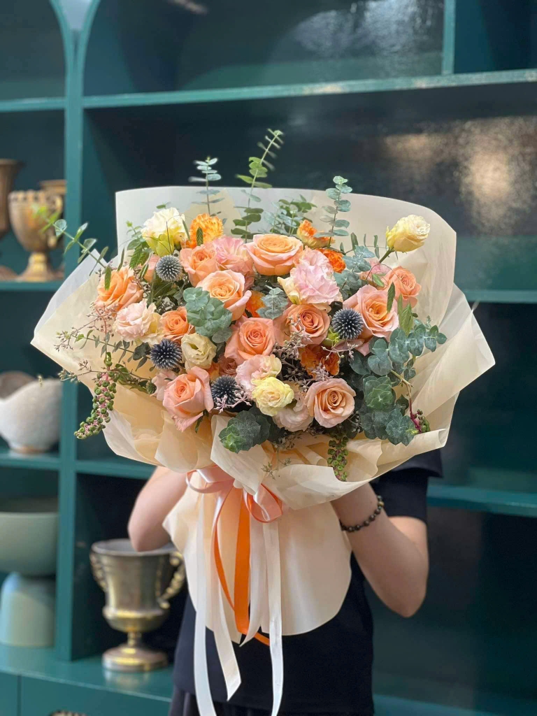 Rạng rỡ mà vẫn nhẹ nhàng, Peachy là bản hòa ca giữa sắc Peach Roses (Hoa hồng đào), Carnation (Hoa cẩm chướng) và Eryngium (Hoa biếc gai) – điểm xuyết bởi Eucalyptus (Lá bạch đàn) xanh mát. Tông cam đào dịu ấm gợi nên niềm vui, sự khởi đầu và năng lượng tích cực – món quà hoàn hảo để gửi lời chúc ngọt ngào trong những ngày đặc biệt.