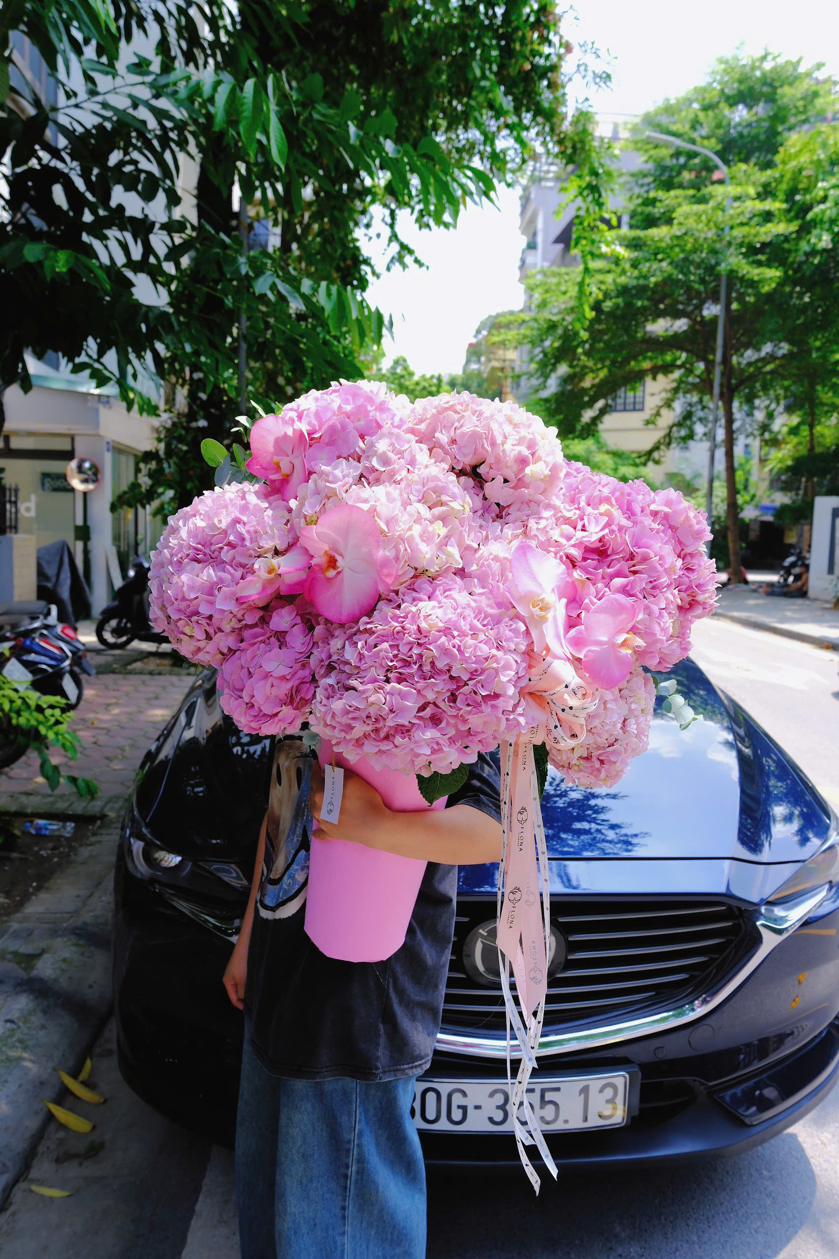 Pink Cloud Symphony – bản hòa ca ngọt ngào của sắc hồng pastel đến từ Hydrangea (cẩm tú cầu) và Phalaenopsis (lan hồ điệp). Bó hoa tựa như đám mây hồng lơ lửng, vừa dịu dàng, vừa kiêu sa – món quà hoàn hảo để gửi tặng yêu thương trọn vẹn.