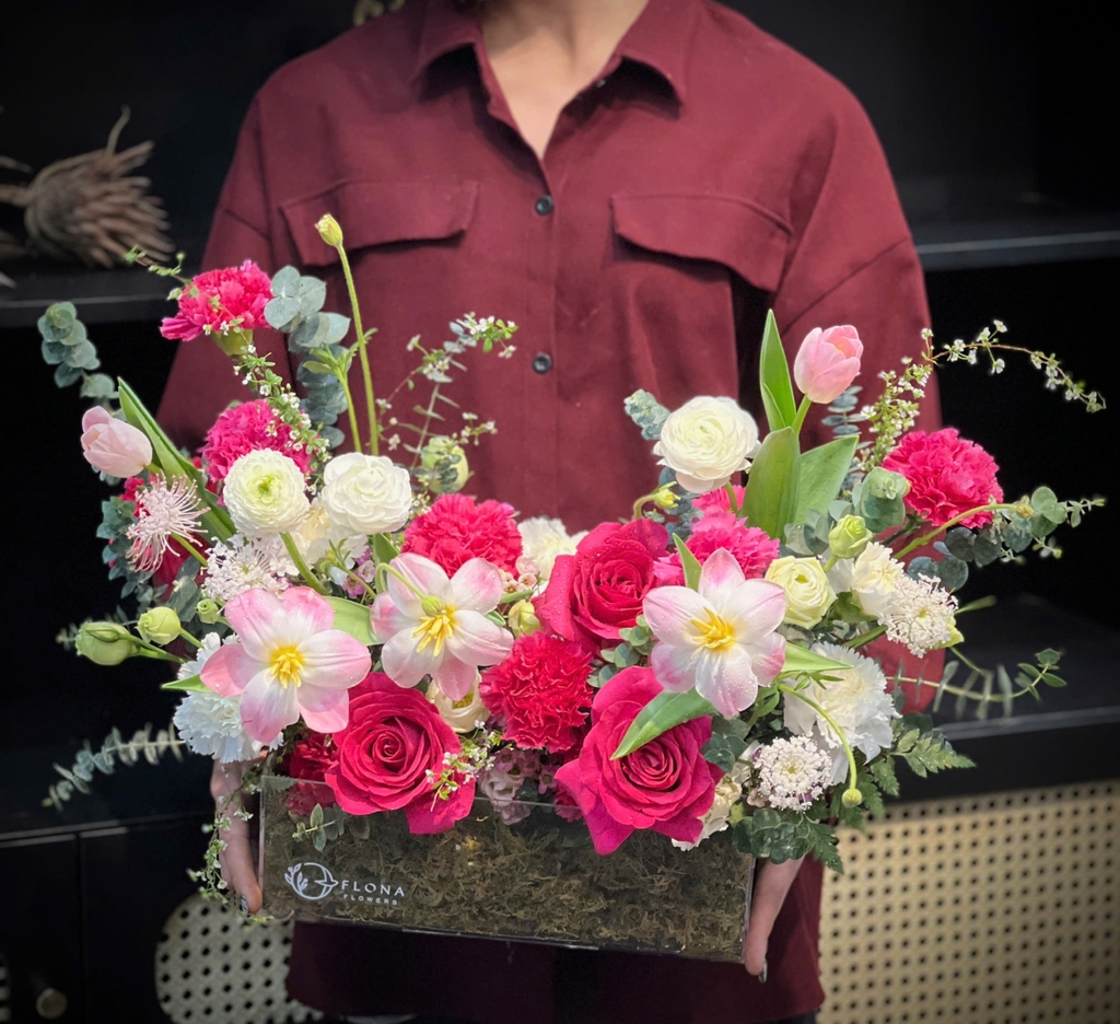 Một thiết kế mang hơi thở của sự tươi mới và rạng rỡ, “Blooming Grace” là bản hòa ca của Hoa hồng đỏ, Tulip hồng và Cẩm chướng hồng– tượng trưng cho niềm vui, tình yêu và sự biết ơn. Mỗi cánh hoa được sắp đặt tinh tế trong hộp acrylic trong suốt, vừa hiện đại vừa đầy cảm xúc.