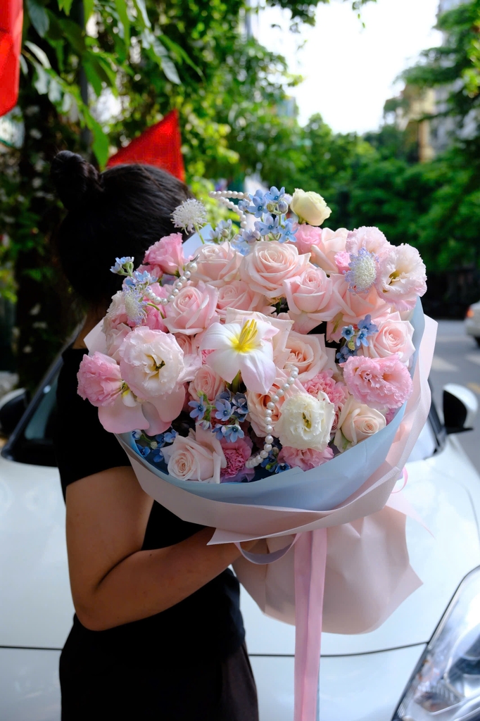 Những cánh Rose (hoa hồng), Lily (hoa ly) và Eustoma (hoa cát tường) hòa quyện cùng sắc xanh nhẹ của Forget-me-not (hoa lưu ly) — tạo nên bản giao hưởng ngọt ngào của sự trong trẻo và yêu thương.