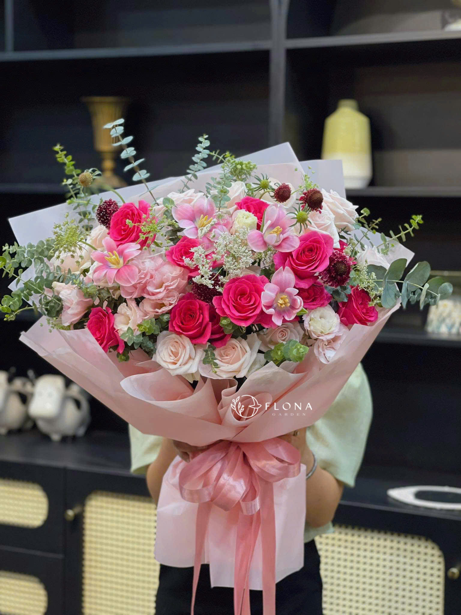 Pink Rhapsody – bản hoà ca ngọt ngào của sắc hồng. Những cánh Rose (hoa hồng) và Alstroemeria (hoa lily Peru) khoe sắc giữa làn lá Eucalyptus (bạch đàn), tạo nên cảm giác dịu dàng, nữ tính nhưng vẫn tràn đầy sức sống. Một bó hoa dành cho những tâm hồn yêu vẻ đẹp tinh tế và lãng mạn.
