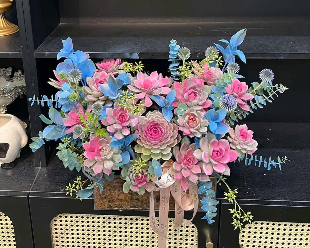 Tựa như đoá hoa trong lăng kính trong suốt, Echeveria (sen đá) hồng lam và Thistle (cúc gai) xanh tím phản chiếu ánh sáng đa sắc. Mỗi cánh hoa lung linh như ánh pha lê, tạo nên vẻ đẹp huyền ảo – vừa hiện đại, vừa mộng mơ.