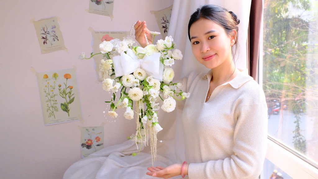 Bó hoa cưới trắng tinh khôi, kết từ những cánh Ranunculus (hoa mao lương) và Lysianthus (hoa cát tường) mềm mại, điểm xuyết chiếc nơ lụa trắng cùng chuỗi ngọc trai thanh khiết. Vẻ đẹp trong trẻo và tinh tế của bó hoa như bản hòa ca thuần khiết, gửi gắm lời chúc phúc ngọt ngào cho tình yêu vĩnh cửu.