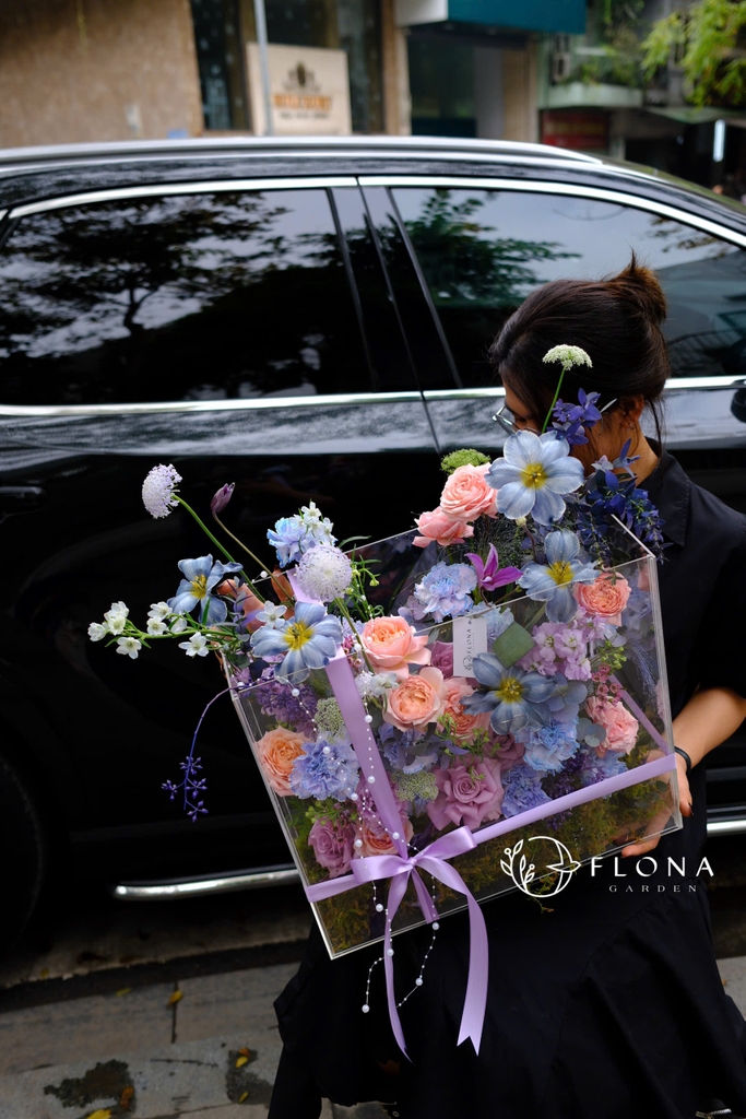 Sắc tím mộng ảo của Delphinium (hoa phi yến) và Hydrangea (cẩm tú cầu) hòa cùng Rose (hoa hồng) pastel trong suốt hộp mica, như khúc nhạc êm ru giữa màn sương sớm. Mỗi đóa hoa như đang trôi giữa làn ánh sáng tím lam, dịu dàng và đầy mê hoặc.