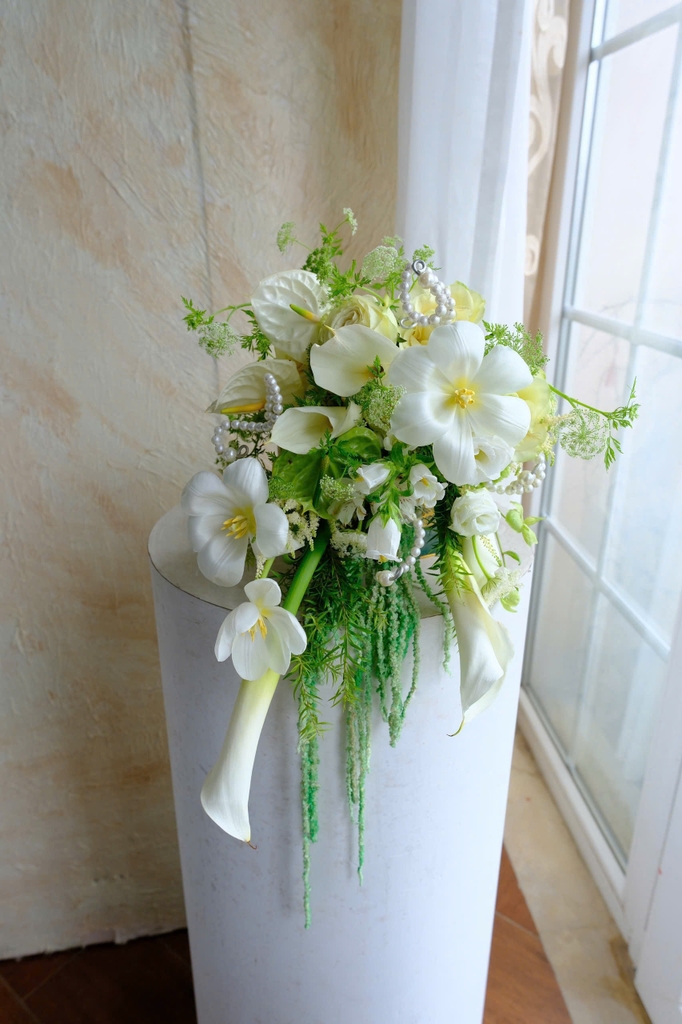Bó hoa cưới mang sắc trắng – vàng ánh nhẹ của Tulip (hoa tulip) và Calla Lily (hoa loa kèn Arum), hòa quyện cùng điểm nhấn ngọc trai tinh tế. Vẻ đẹp thanh thoát và tươi sáng ấy tựa lời chúc phúc cho một hôn lễ tràn đầy ấm áp, nơi tình yêu và bình yên cùng đong đầy trong từng nhịp thở hạnh phúc.
