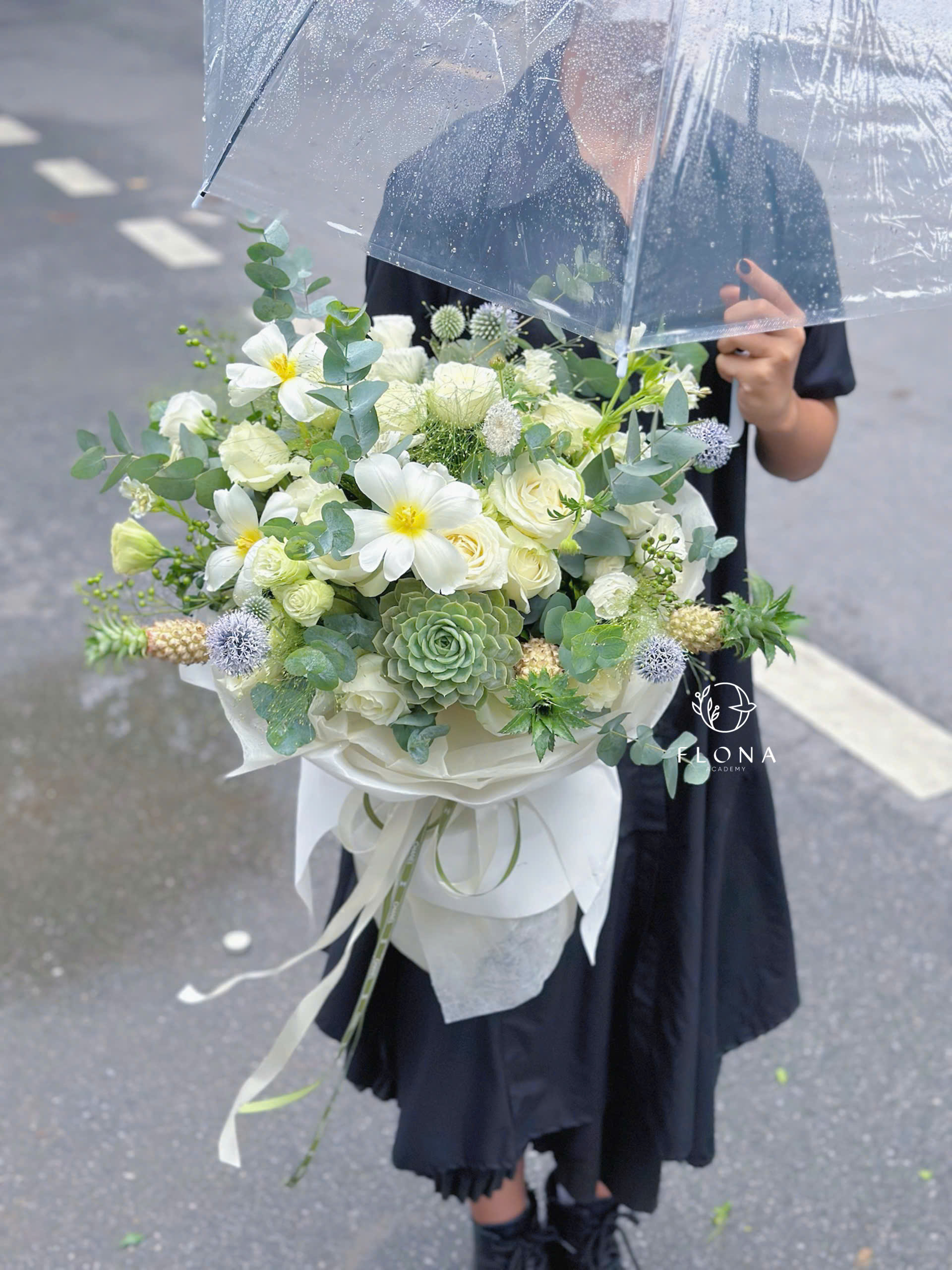 Dưới làn mưa mỏng, Rainy Serenade khẽ ngân lên giai điệu của sự bình yên – nơi sắc white rose (hồng trắng), cosmos (hoa sao nhái trắng) và eucalyptus (bạch đàn) hòa quyện cùng chút xanh dịu của succulent (sen đá).