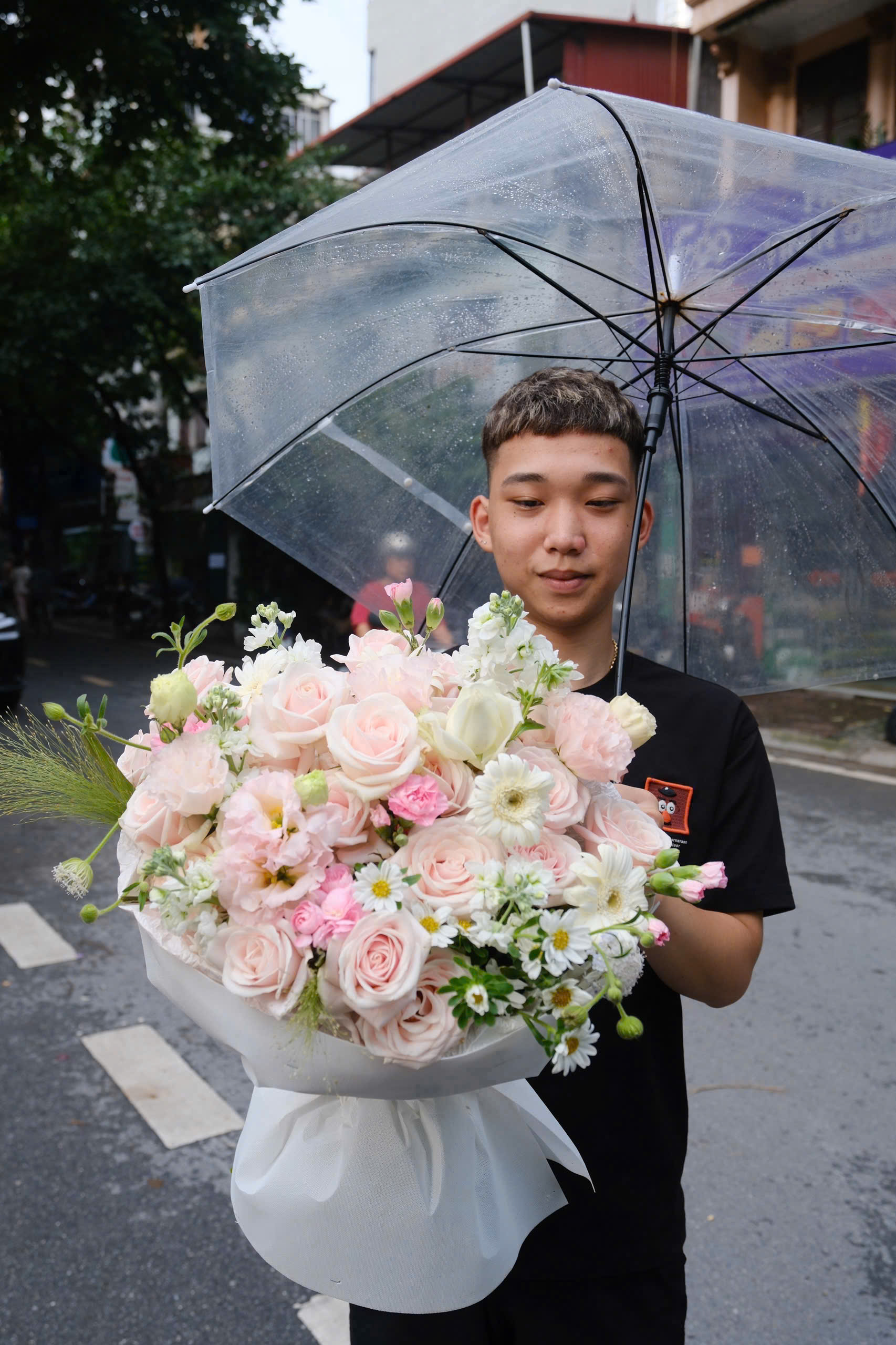 Rainy Serenade – bản tình ca trong mưa, nơi những đóa Blush Rose (hoa hồng phấn) và Chamomile (hoa cúc họa mi) hòa quyện cùng Lisianthus (hoa cát tường) dịu dàng. Bó hoa mang hơi thở trong trẻo, nhẹ nhàng như giọt mưa đầu hạ, dành tặng cho những tâm hồn yêu sự bình yên và ngọt ngào.