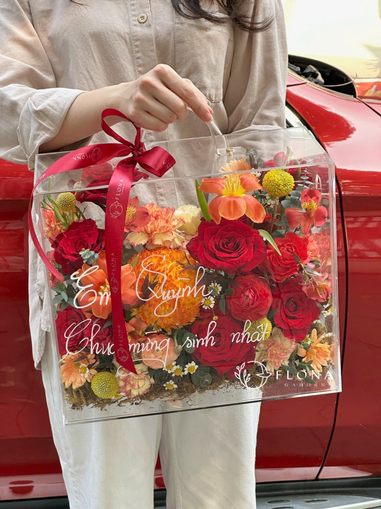 Một khúc tình ca nồng nàn được dệt nên từ Red Rose (Hoa hồng đỏ), Orange Tulip (Hoa tulip cam) và Chrysanthemum (Hoa cúc mẫu đơn). Sắc đỏ quyến rũ hòa cùng cam rực rỡ, tựa như ngọn lửa yêu thương không bao giờ tắt. Một món quà sang trọng dành tặng những khoảnh khắc đặc biệt.