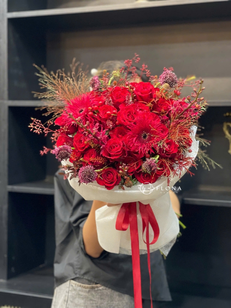 "Red Requiem" là khúc nhạc trầm hùng của Rose (hoa hồng đỏ) và Chrysanthemum (cúc mẫu đơn đỏ), điểm nhấn với Gerbera (hoa đồng tiền) và lá khô ánh đồng.