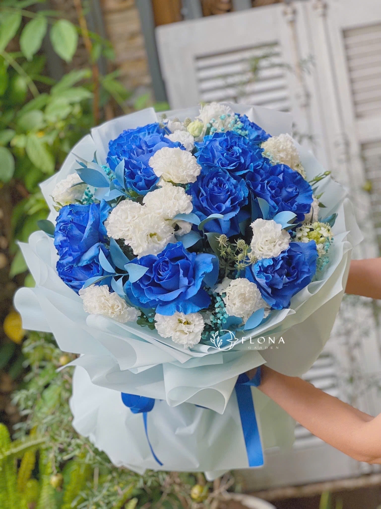 Những cánh Blue Rose (hồng xanh) và Carnation (hoa cẩm chướng) đan xen nhau tạo nên bản nhạc dịu dàng, thanh khiết — món quà gửi gắm sự an yên và lời nhắn yêu thương không lời.