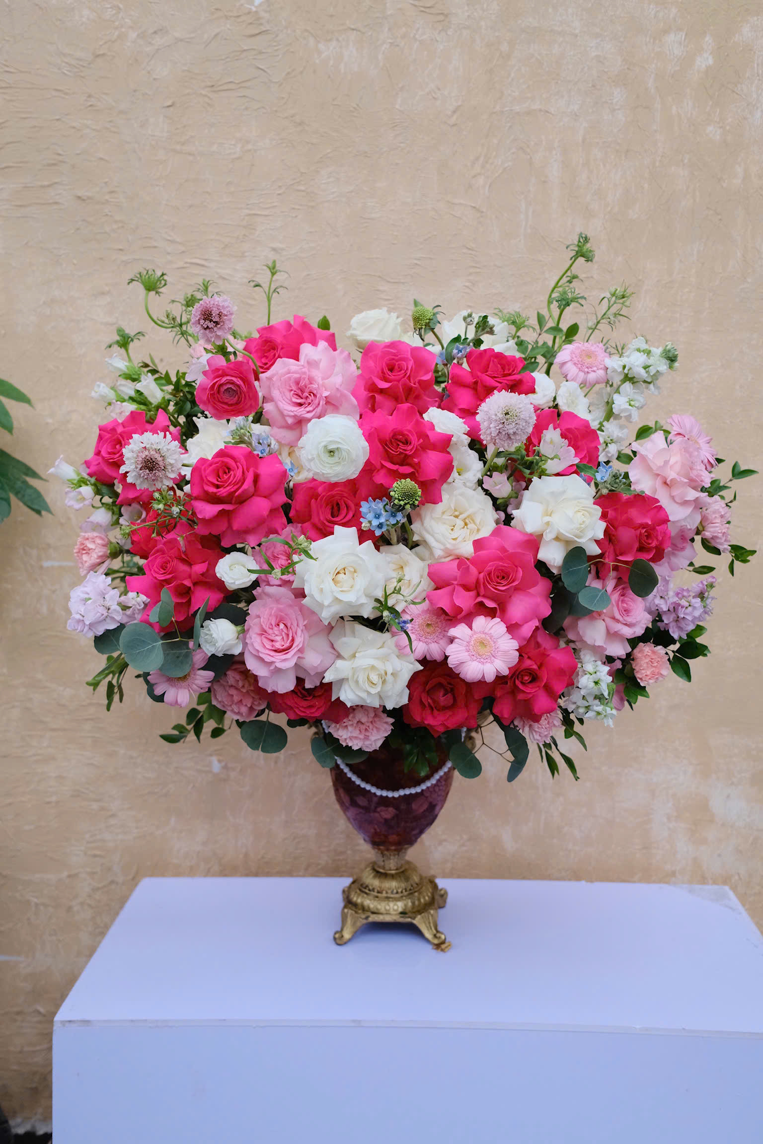 Rosy Reverie – giấc mơ hồng ngọt ngào của những đóa hoa hồng, cúc mẫu đơn, và điểm xuyết Scabiosa (hoa bi tím) dịu dàng. Sắc hồng phớt hòa cùng trắng như bản tình ca dịu nhẹ, mang đến cảm giác trong veo và đầy yêu thương.
