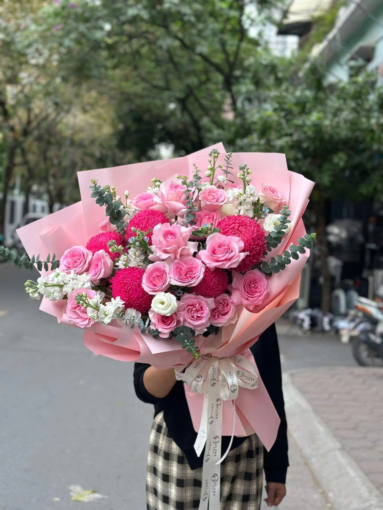 Rosy Whisper – lời thì thầm của sắc hồng, nơi những đóa Pink Rose (hoa hồng hồng) và Chrysanthemum (hoa cúc mẫu đơn hồng đậm) hòa quyện cùng Eucalyptus (lá bạch đàn) tạo nên vẻ đẹp ngọt ngào, tươi tắn. Bó hoa như hơi thở dịu dàng của tình yêu, nhẹ nhàng chạm vào trái tim người nhận.
