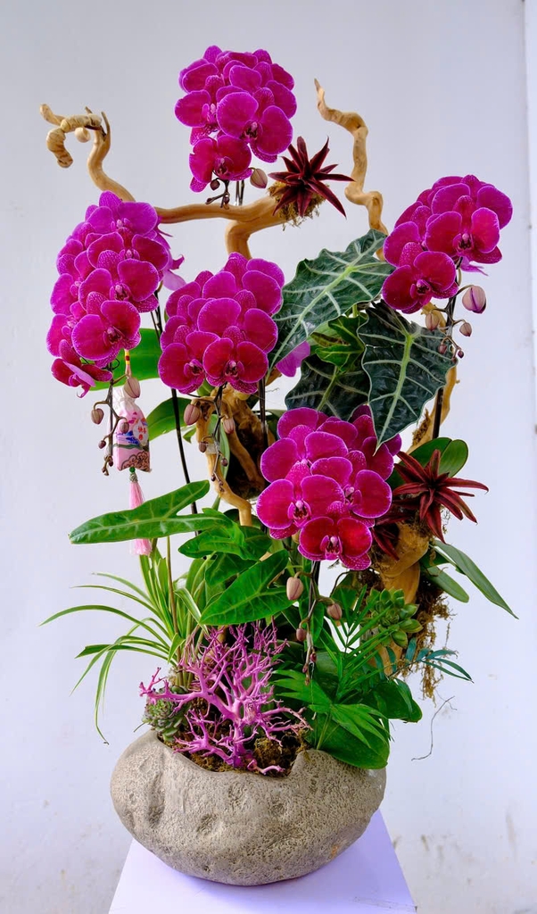 Royal Radiance – tác phẩm tỏa sáng với sắc tím quý phái của Phalaenopsis Orchid (lan hồ điệp), biểu trưng cho quyền lực và sự sang trọng. Từng cánh hoa căng tràn sức sống, đan xen cùng sắc xanh của Alocasia (môn cảnh) và điểm nhấn Succulent (sen đá), tạo nên tổng thể hài hòa, đẳng cấp.