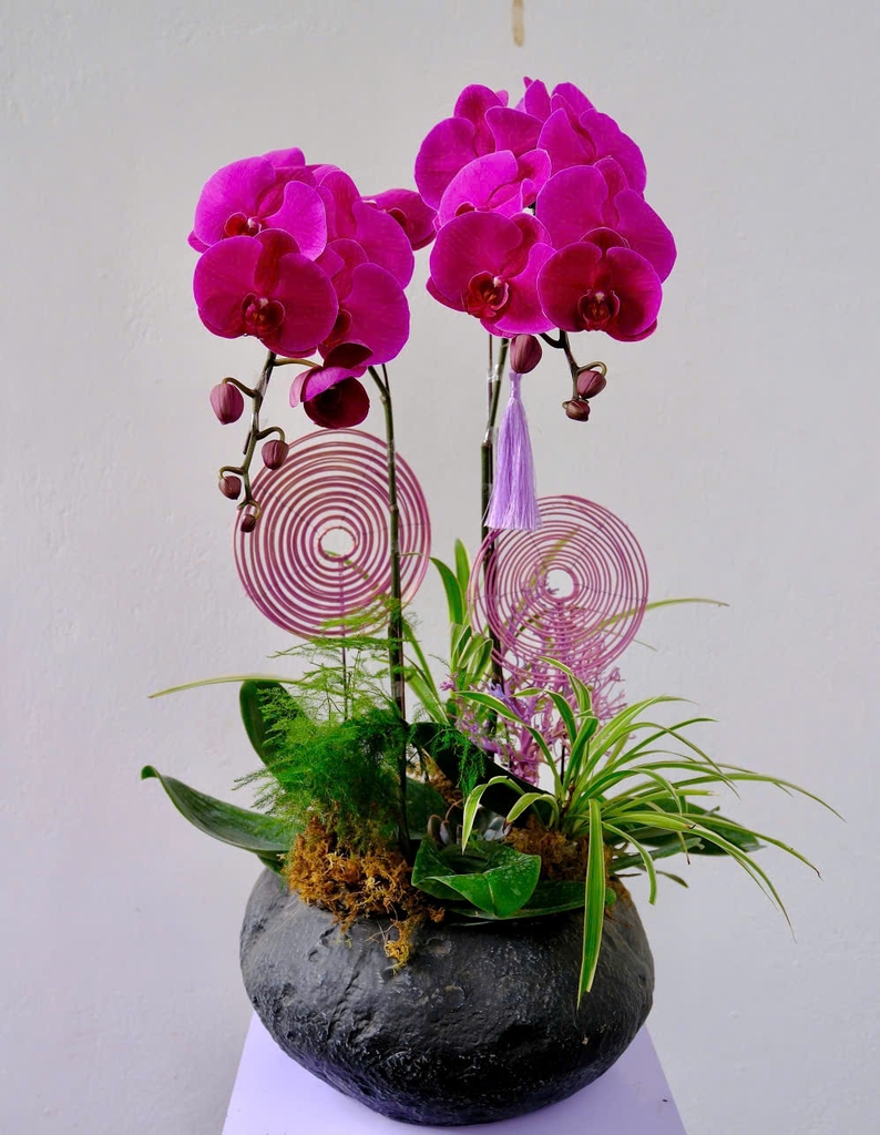 Tinh giản mà quyền quý, Royal Serenity tỏa sáng với sắc tím sang trọng của Phalaenopsis Orchid (lan hồ điệp) – biểu tượng của sự thành đạt và phong thái đĩnh đạc. Hai nhánh hoa vươn thẳng như đôi cánh kiêu hãnh, nhẹ nhàng rủ xuống với nét mềm mại đầy cuốn hút. Xen giữa là Asparagus Fern (dương xỉ mảnh mai) và Succulent Plant (sen đá) – tạo nên bản hòa ca của sức sống và sự điềm tĩnh. Trong chiếc chậu đá đen nhám mang dáng dấp hiện đại, tác phẩm như một lời khẳng định tinh tế về đẳng cấp của người sở hữu.