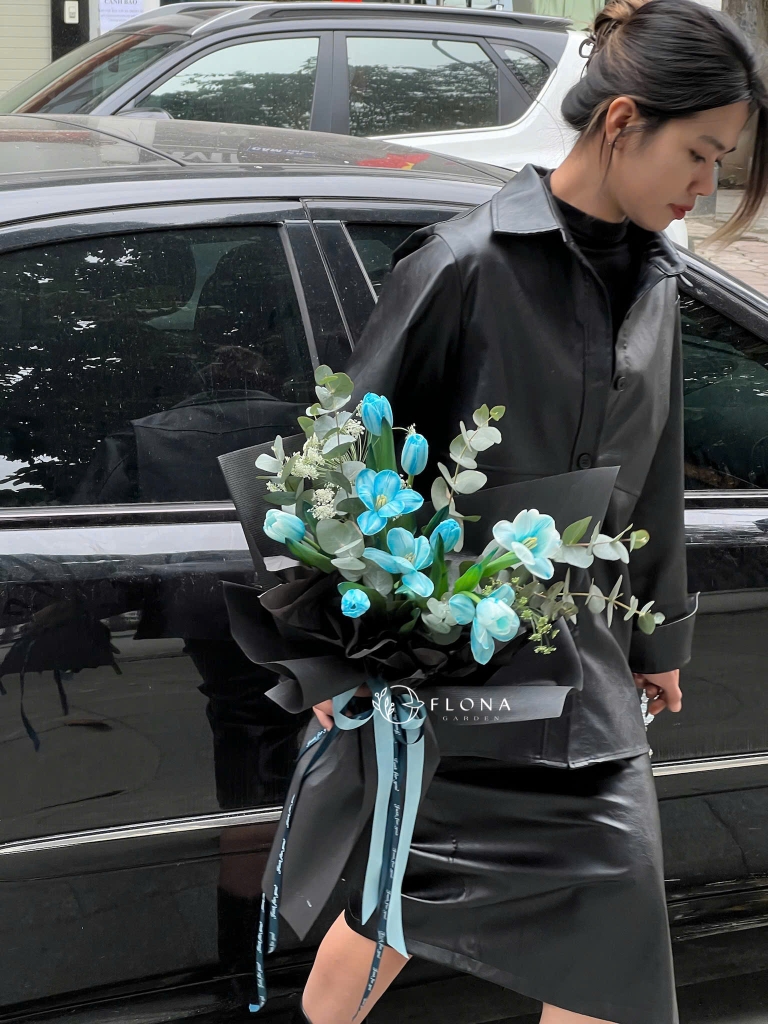 Mang sắc xanh lam huyền bí như ánh trăng soi trên mặt nước, Ruby Azure là sự kết hợp độc đáo giữa Blue Tulips (Tulip xanh lam) và Eucalyptus (Lá bạch đàn) trên nền giấy đen sang trọng. Từng cánh hoa như phản chiếu vẻ đẹp lạnh lùng, tinh tế và đầy cuốn hút — dành cho những tâm hồn mạnh mẽ, yêu sự khác biệt và luôn tỏa sáng trong tĩnh lặng.