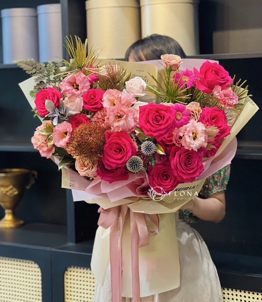 Ruby Sonata – khúc nhạc rực rỡ của sắc đỏ và hồng. Những cánh Rose (hoa hồng) tươi thắm hòa cùng Lisianthus (hoa cát tường) và Chrysanthemum (hoa cúc mẫu đơn), điểm nhấn bởi vài nhành lá vàng đồng ánh kim, mang đến cảm giác nồng nàn, sang trọng và quyến rũ. Một bó hoa dành cho những tâm hồn tự tin, mạnh mẽ và yêu cái đẹp đầy cảm xúc.