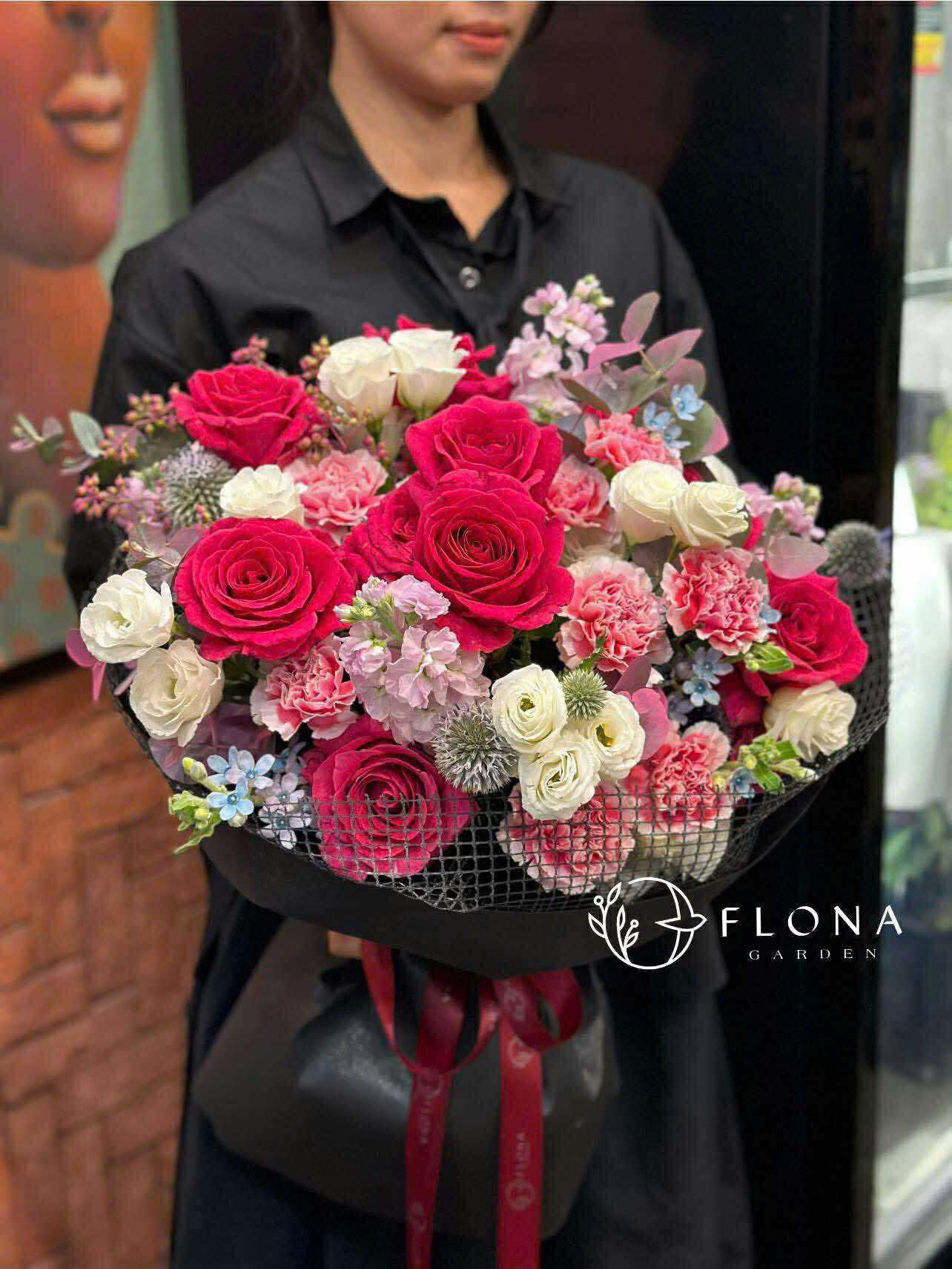 Những cánh Rose (hoa hồng) và Carnation (hoa cẩm chướng) đan xen cùng Ranunculus (hoa mao lương) và Eucalyptus (bạch đàn), vẽ nên khúc tình ca ấm áp dành cho những trái tim đang yêu.