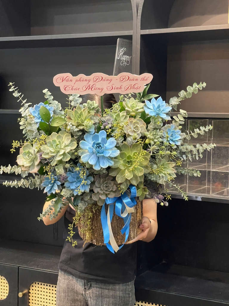 Tựa làn gió biển khẽ qua buổi sớm, Azure Whisper mang sắc xanh mát lành của Echeveria – Sen đá, điểm xuyết bởi những nhánh Eucalyptus – Bạch đàn, Veronica – Cỏ đuôi chồn xanh tím, và Brunia – Chùm bi bạc.