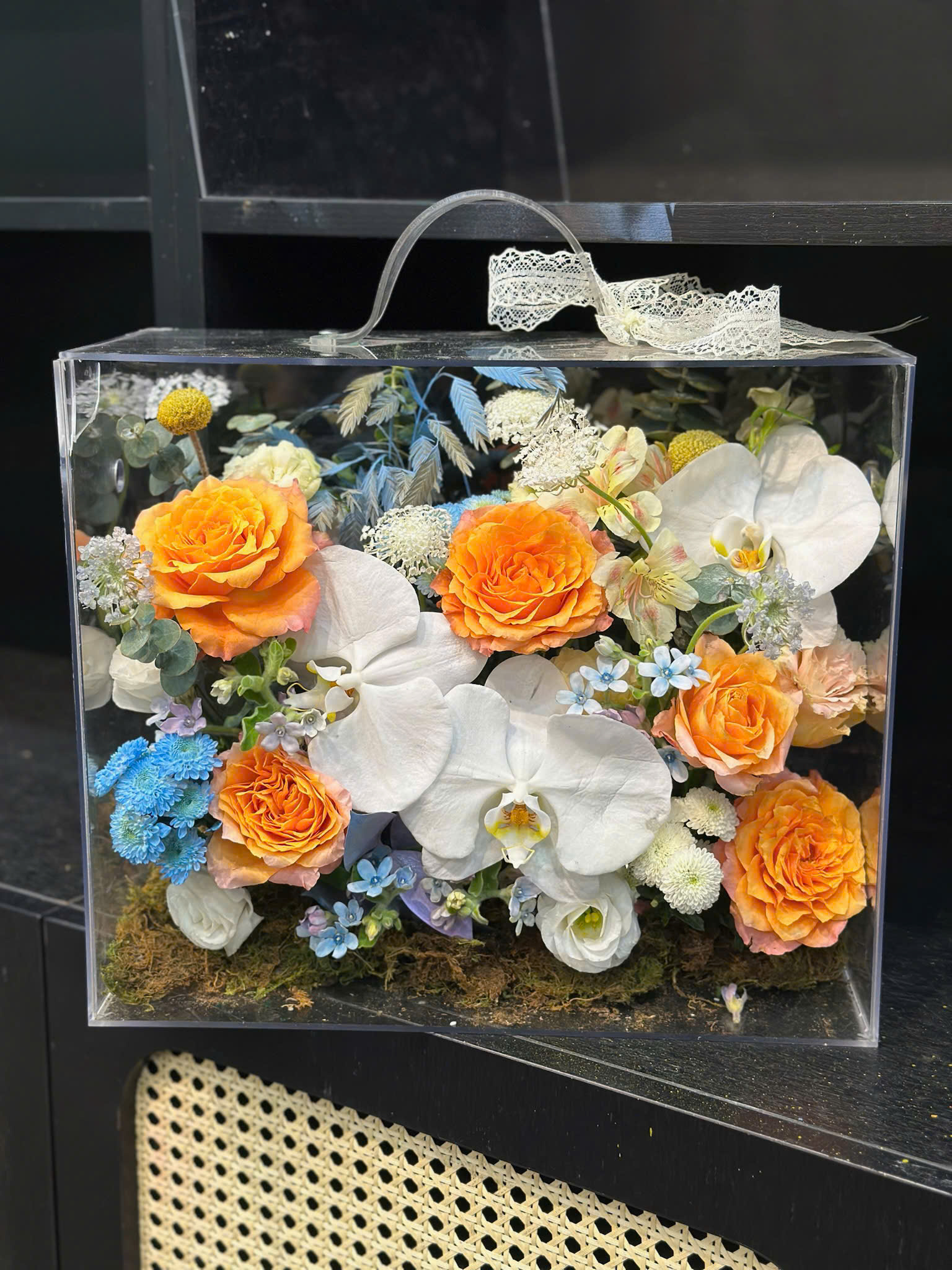 Rực rỡ mà thanh tao, Rose (Hoa hồng cam) cùng Phalaenopsis (Lan hồ điệp trắng) vẽ nên bức tranh khu vườn sáng rỡ trong ánh nắng sớm. Sunshine Garden mang hơi thở ấm áp, tinh khôi – như món quà dịu dàng gửi tặng những tâm hồn yêu cái đẹp.