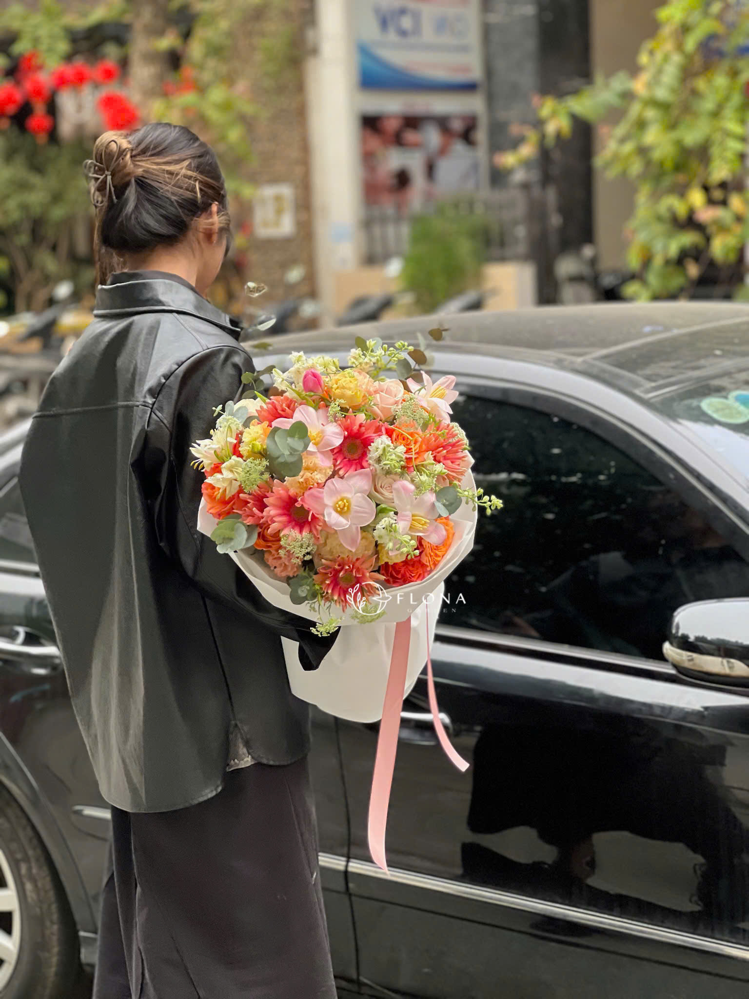 Sunlit Gold mang theo hơi thở của một buổi sáng trong vườn – nơi ánh nắng sớm dịu dàng chạm lên từng cánh Gerbera (Đồng tiền), Ranunculus (Mao lương) và Anemone (Hoa hải quỳ). Sắc cam đào pha hồng nhẹ được nâng đỡ bởi những tán Eucalyptus (Bạch đàn) xanh mát, tạo nên bản hòa âm của niềm vui và năng lượng tích cực. Như một lời chào rực rỡ gửi đến ngày mới, bó hoa khiến người ta mỉm cười chỉ bằng một ánh nhìn.