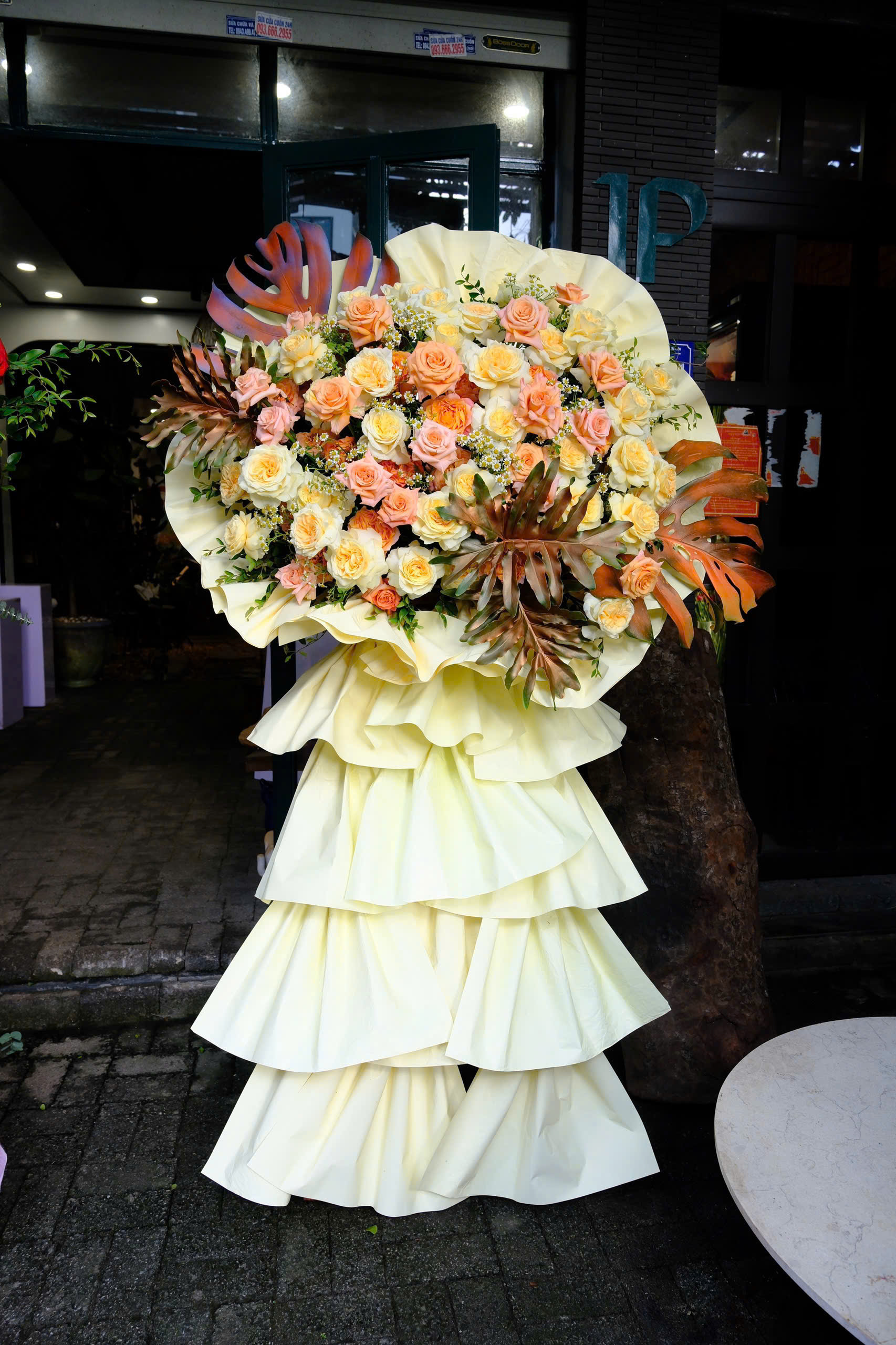 Sunlit Grace là kệ hoa mang sắc vàng – cam – kem nhẹ nhàng như ánh nắng ban mai. Sự hòa quyện tinh tế của Rose (hoa hồng) và Chrysanthemum (cúc mẫu đơn) tỏa sáng trong từng lớp giấy vàng mềm mại, gửi lời chúc khai trương rạng rỡ, thuận lợi và viên mãn như ngày nắng đầu tiên.
