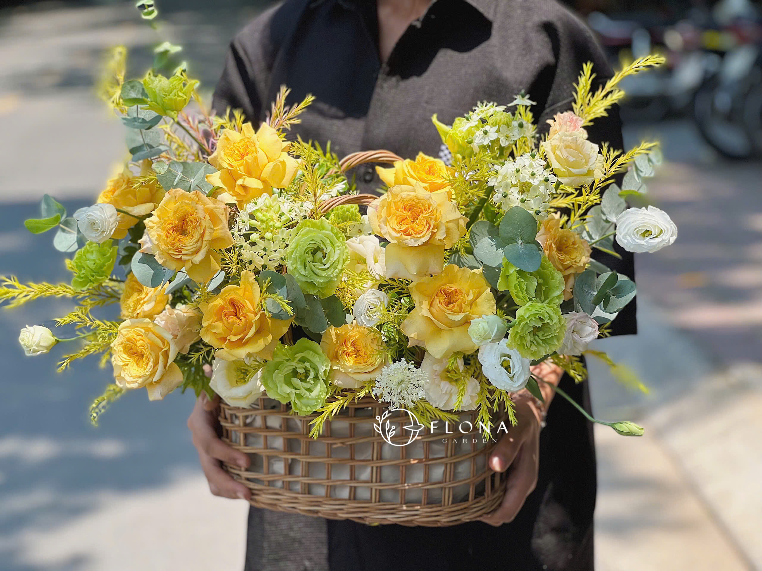 Giỏ hoa như khúc hát của nắng, rực rỡ mà vẫn dịu dàng. Những cánh Rose (hoa hồng) vàng và Lisianthus (cát tường) xanh nhạt hòa vào nhau, tỏa ra hương sắc của buổi sáng trong veo giữa khu vườn đang hát.