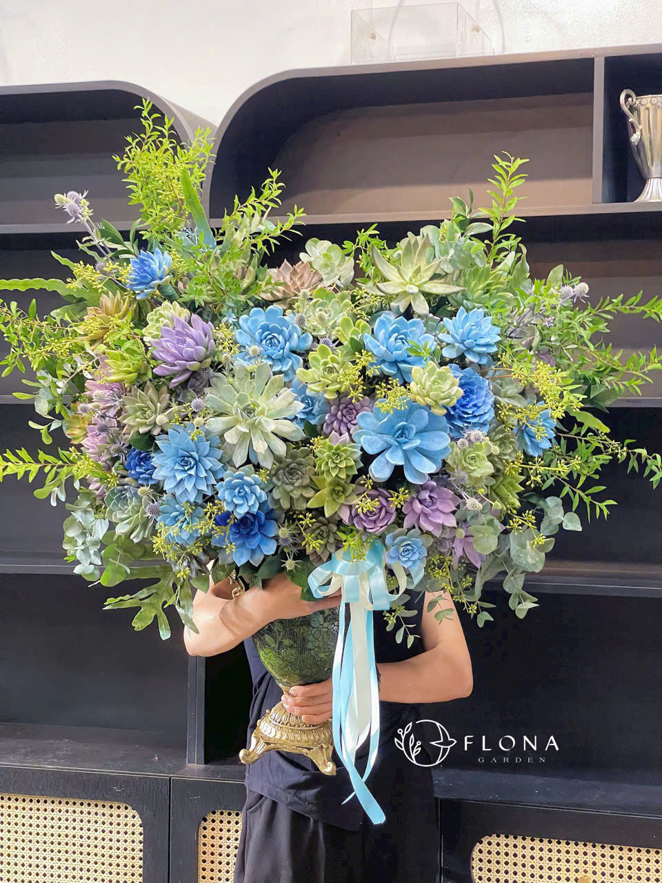 Một bản hòa ca của sắc xanh – nơi những cánh Echeveria xanh lam, tím sương và ngọc bích hòa cùng nhánh fern uốn lượn, tạo nên bức tranh thiên nhiên đầy thanh khiết và kiêu sa. Sylvane mang vẻ đẹp sang trọng, hiện đại và đầy cảm xúc – như làn gió mát khẽ chạm giữa khu vườn xanh thẳm, khơi dậy cảm giác an yên và tự do.