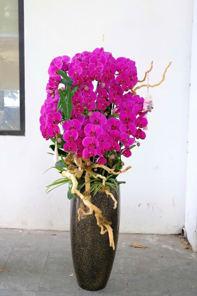 The Grand Duchess mang phong thái quý tộc và sang trọng như một biểu tượng của quyền lực mềm. Những cành Phalaenopsis Orchid tím đậm bung nở đồng loạt, xếp tầng uy nghi, kết hợp với dáng chậu cao ánh đồng và rễ gỗ uốn lượn tự nhiên, tạo nên một tổng thể đẳng cấp và đầy khí chất.
