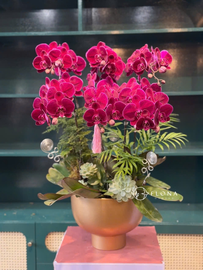 The Monarch’s Charm – một tuyệt phẩm lan hồ điệp toát lên khí chất quyền uy và sang trọng. Sắc tím đỏ rực rỡ của Phalaenopsis Orchid (lan hồ điệp) nổi bật trên nền chậu vàng đồng, tượng trưng cho thịnh vượng, thành công và sự tự tin của người lãnh đạo.