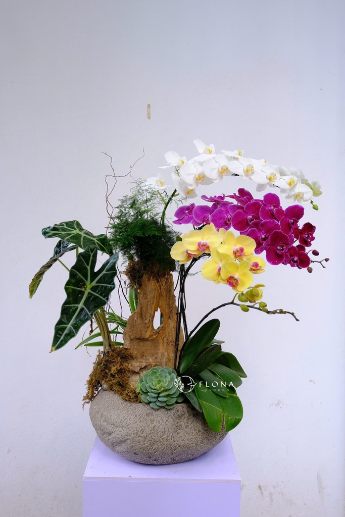 Ba sắc thái – ba tầng ý nghĩa, Trinity of Prosperity là sự hòa quyện tinh tế giữa Phalaenopsis Orchid (lan hồ điệp) trắng tinh khôi, tím quyền lực và vàng phú quý. Mỗi sắc hoa đại diện cho một giá trị sống: thanh khiết – bản lĩnh – thịnh vượng. Thân gỗ tự nhiên làm trụ vững chãi, cùng Succulent Plant (sen đá) điểm xanh đầy sinh khí, tạo nên một bố cục tượng trưng cho sự cân bằng và viên mãn trong hành trình thành công.