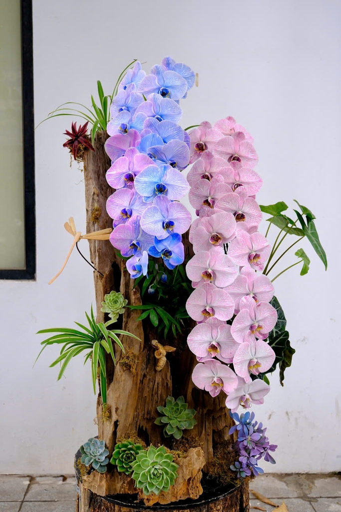 Twin Harmony – bản hòa ca của sắc lam và hồng, nơi hai nhánh Dyed Phalaenopsis Orchid (lan hồ điệp nhuộm) song hành như biểu tượng cho tình yêu cân bằng và thành công song đôi. Giữa nền gỗ lũa thô mộc và mảng xanh của succulent (sen đá), tác phẩm mang năng lượng hài hòa và hành trình vươn tới thịnh vượng.