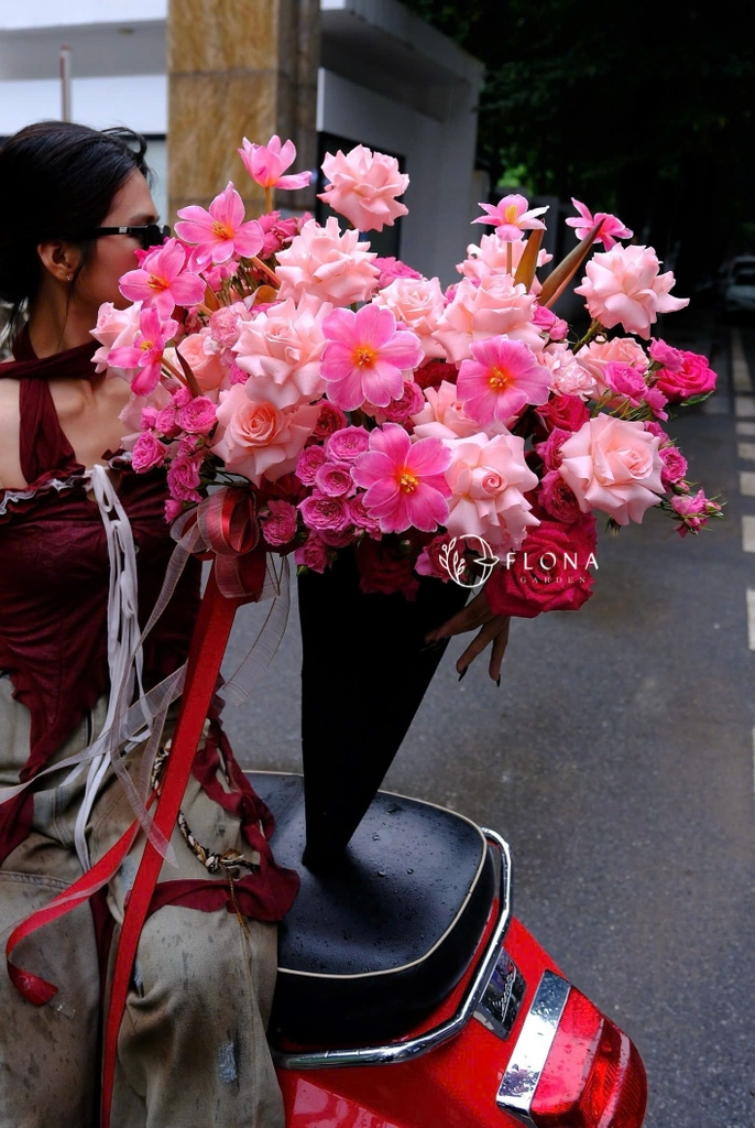 Velvet Candy – sắc hồng ngọt ngào tựa dải lụa nhung, kết hợp Pink Rose (hồng pastel), Hot Pink Rose (hồng đậm) và Cosmos (hoa cúc vạn thọ anh đào). Mỗi cánh hoa như thì thầm về một tình yêu nồng nàn, kiêu sa nhưng vẫn đầy dịu dàng, khiến trái tim khẽ rung trong từng ánh nhìn.