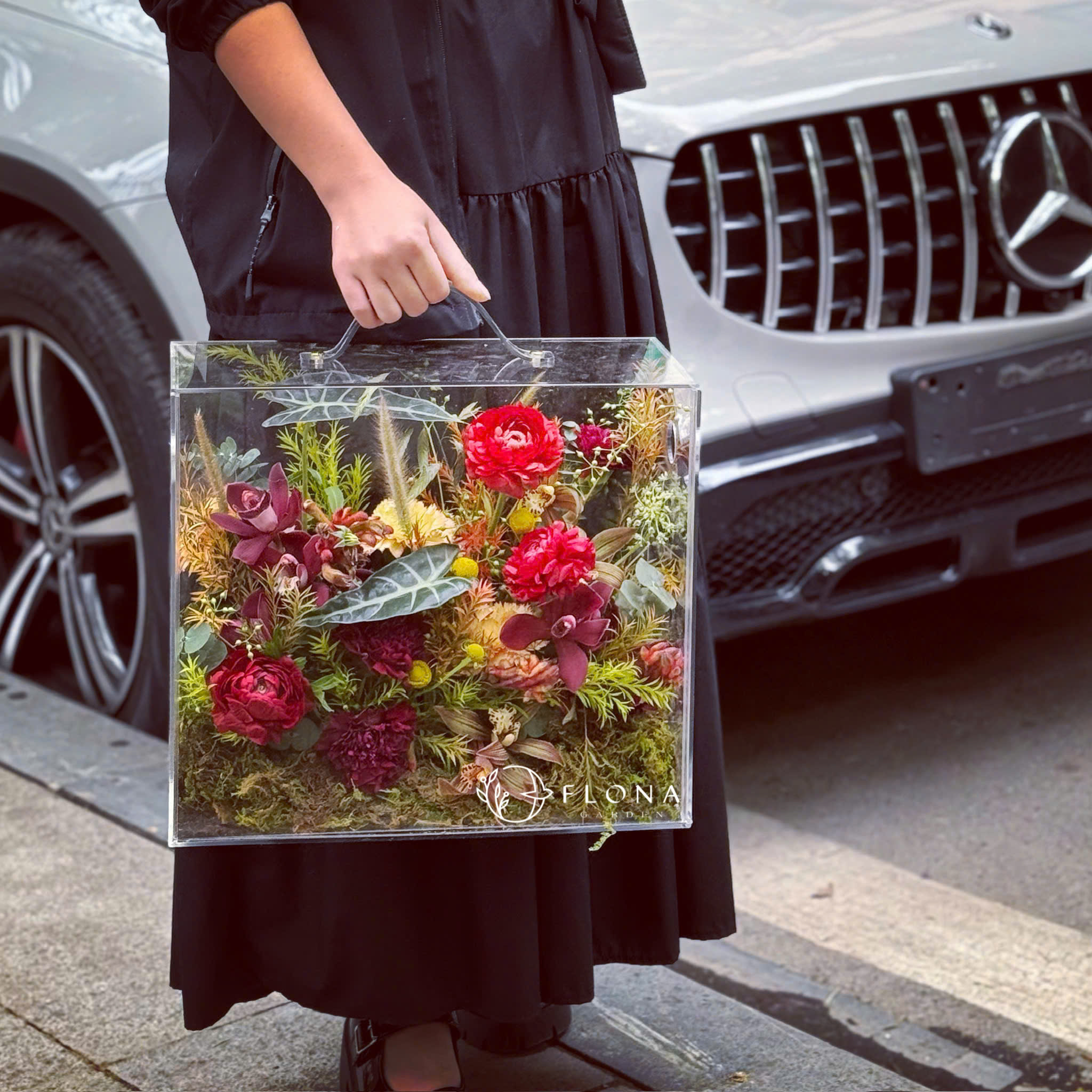 Một khu rừng thu nhỏ ẩn mình trong chiếc hộp trong suốt, nơi Ranunculus (Hoa mao lương) đỏ thắm và Burgundy Orchid (Lan đỏ rượu vang) đan xen cùng lá Alocasia (Môn đen) tạo nên chiều sâu huyền bí. Từng cánh hoa như thấm đẫm hơi thở của đất, mang đến vẻ đẹp sang trọng và bí ẩn như bản giao hưởng của rừng sâu.