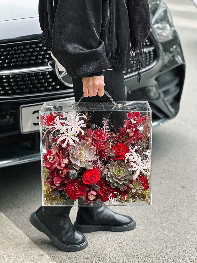 Một nốt trầm trong bản giao hưởng sắc hoa, nơi Rose (hoa hồng) đỏ rượu vang hòa cùng Succulent (sen đá) ánh bạc và Orchid (lan) đỏ thẫm. “Velvet Shadow” là khúc thì thầm của sự sang trọng và nội lực — nơi ánh sáng khẽ lướt qua khối mica trong veo, phản chiếu vẻ đẹp sâu lắng và bản lĩnh của người sở hữu.
