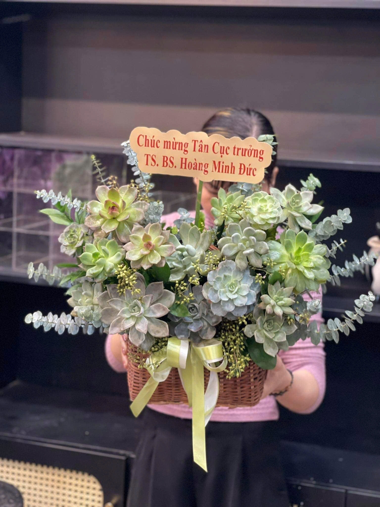 Verdant Grace – bản hòa ca thanh khiết của những sắc xanh ngọc và bạc khói, tỏa sáng trong sự tinh giản nhưng đầy sức sống. Tác phẩm kết hợp từ Echeveria (sen đá tán lớn), Eucalyptus (bạch đàn) và Hypericum berries (tỳ bà xanh) – những loài cây tượng trưng cho sự bền vững, trí tuệ và thành công. Một món quà sang trọng, tinh tế, gửi gắm lời chúc “thành công vững bền – tâm an tựa lá xanh”.