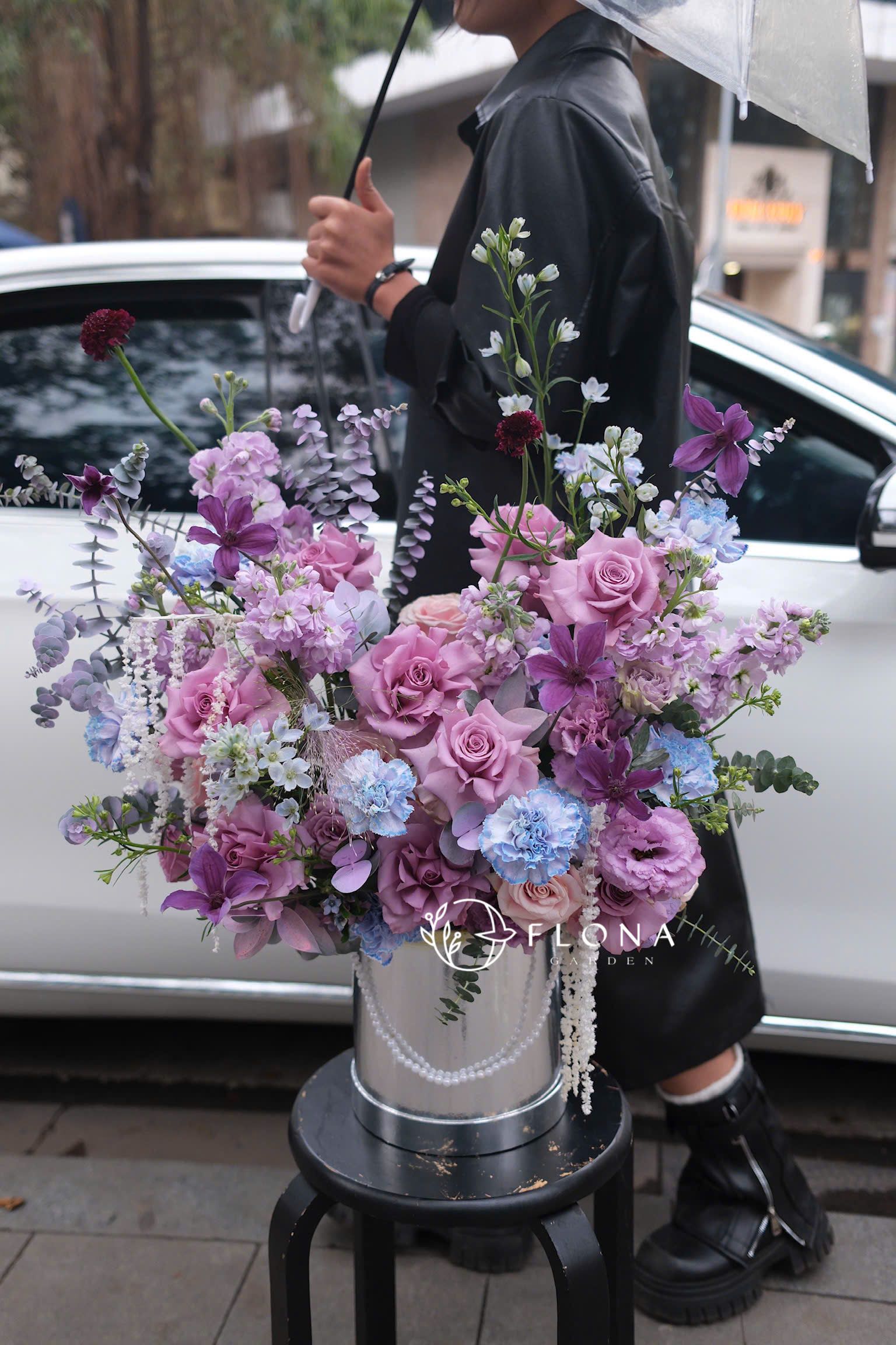Hộp hoa Violet Rain tựa như bản tình ca dịu êm giữa cơn mưa tím — nơi sắc tím lilac của Rose (hoa hồng) và xanh lam của Carnation (hoa cẩm chướng) hòa vào nhau, tạo nên một bản hòa âm nhẹ nhàng và sâu lắng. Mỗi bông hoa là một giọt mưa ký ức, khẽ chạm vào tim người nhận.