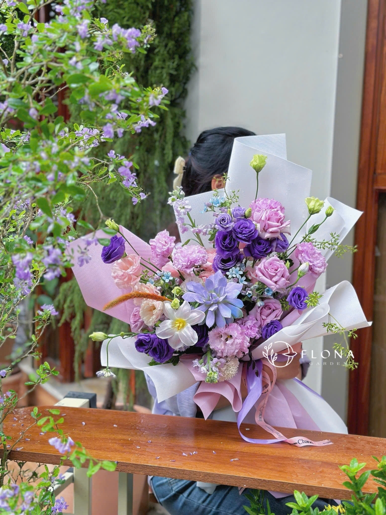 Giai điệu tím mơ màng của khu vườn oải hương, nơi những đóa Purple Rose (hoa hồng tím) và Carnation (hoa cẩm chướng hồng phấn) khẽ hòa cùng Lily (hoa ly trắng) tạo nên bản nhạc êm đềm. Bó hoa mang đến cảm giác thanh thoát, tinh khôi và đầy lãng mạn – như một nốt nhạc khẽ ngân trong buổi sớm yên lành.
