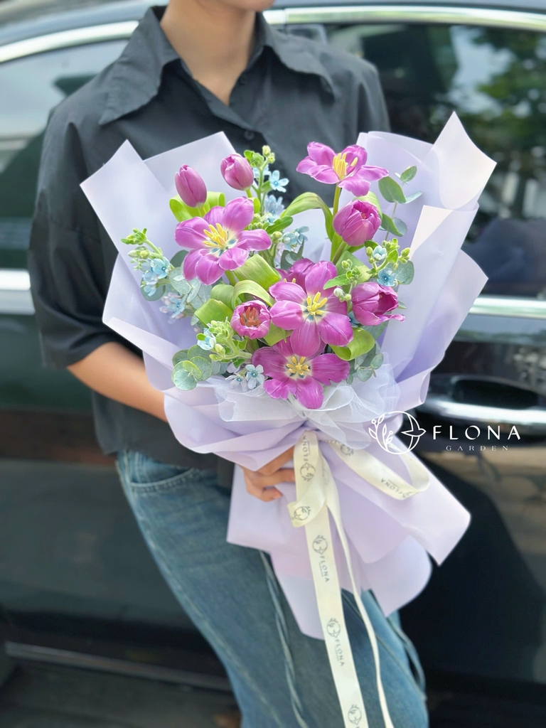 Nơi những đóa Tulip (hoa tulip tím) khẽ nghiêng mình trong làn gió cùng Forget-me-not (hoa lưu ly xanh) bé nhỏ. Bó hoa mang hơi thở của mộng mơ, dịu dàng và thanh khiết như bản nhạc dành riêng cho những tâm hồn yêu sự nhẹ nhàng.