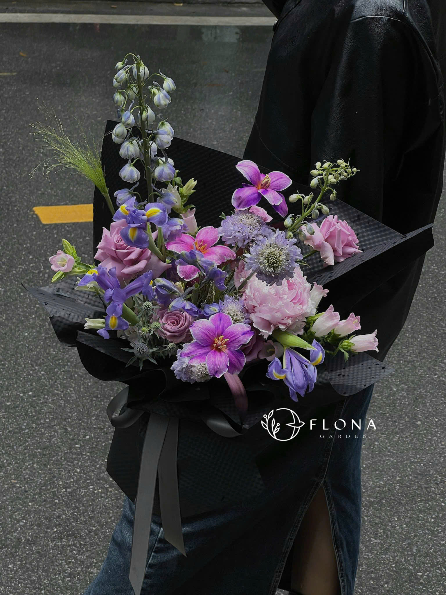 Violet Rain gợi nhớ khoảnh khắc những giọt mưa khẽ rơi trên con phố vắng, khi sắc tím hòa vào không gian ẩm ướt đầy mộng mị. Bó hoa kết hợp tinh tế giữa Delphinium (Hoa phi yến), Iris (Diên vĩ), Roses (Hoa hồng tím), Cosmos (Cúc vũ trụ) và Peony (Mẫu đơn) phớt hồng — mang đến cảm giác an yên, nhẹ nhàng và sâu lắng. Mỗi cánh hoa như một lời thì thầm của mưa, vừa lạnh vừa dịu, vừa thực vừa mơ.