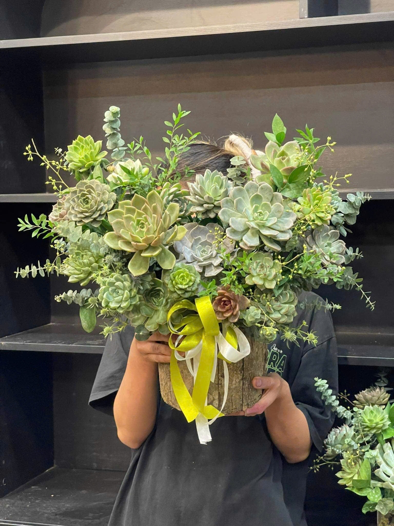 “Whispering Grove” mang dáng vẻ của khu vườn tĩnh lặng — nơi những Succulent (sen đá) đan xen cùng Eucalyptus (bạch đàn) và lá xanh non, kể câu chuyện về sức sống bền bỉ và sự an yên trong từng nhịp thở. Một món quà dung dị mà đầy thanh nhã, gửi đến những tâm hồn yêu thiên nhiên và sự bình yên.