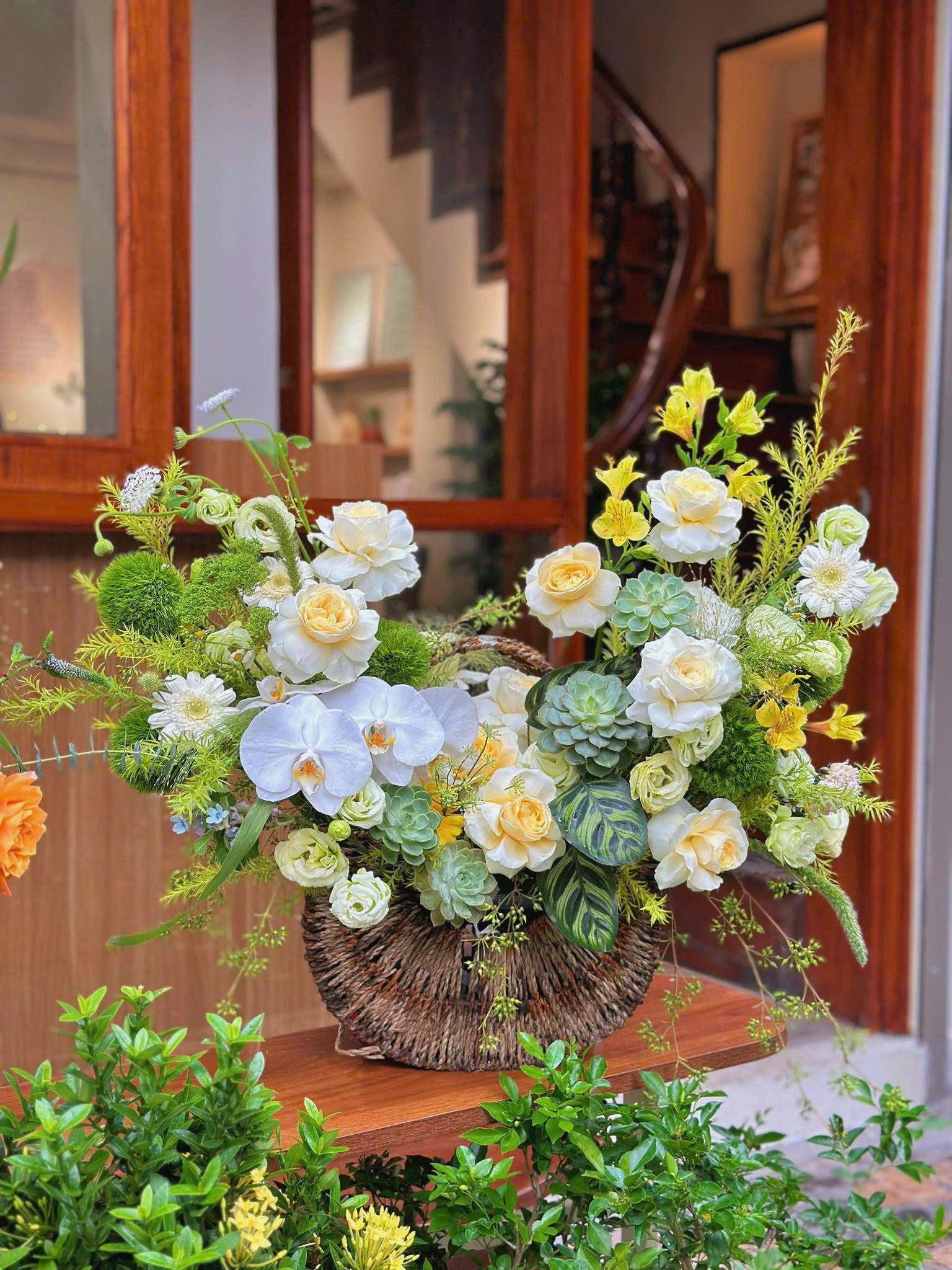 Một góc khu vườn khẽ thì thầm, nơi Orchid (lan hồ điệp) trắng và Rose (hoa hồng) vàng nhạt nở giữa sắc xanh dịu của lá. Tất cả hòa thành bản nhạc của sự tinh khôi và an yên, như hơi thở nhẹ trong buổi sớm trong lành.